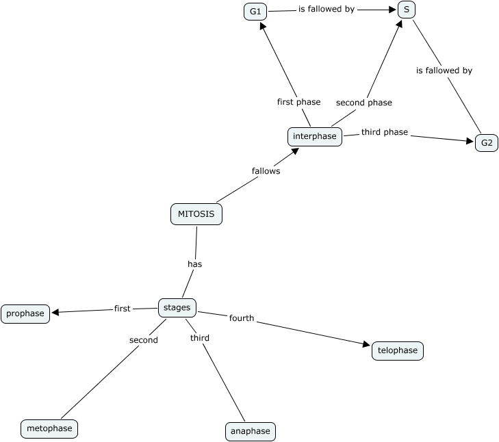 This Concept Map, created with IHMC CmapTools, has information related to: mitosis ck, stages third anaphase, interphase third phase G2, MITOSIS has stages, S is fallowed by G2, interphase second phase S, stages fourth telophase, G1 is fallowed by S, stages first prophase, stages second metophase, interphase first phase G1, MITOSIS fallows interphase