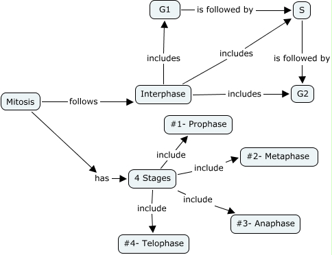 This Concept Map, created with IHMC CmapTools, has information related to: Mitosis-SEB, Interphase includes S, S is followed by G2, Interphase includes G1, Interphase includes G2, 4 Stages include #1- Prophase, G1 is followed by S, 4 Stages include #4- Telophase, Mitosis follows Interphase, 4 Stages include #3- Anaphase, 4 Stages include #2- Metaphase, Mitosis has 4 Stages