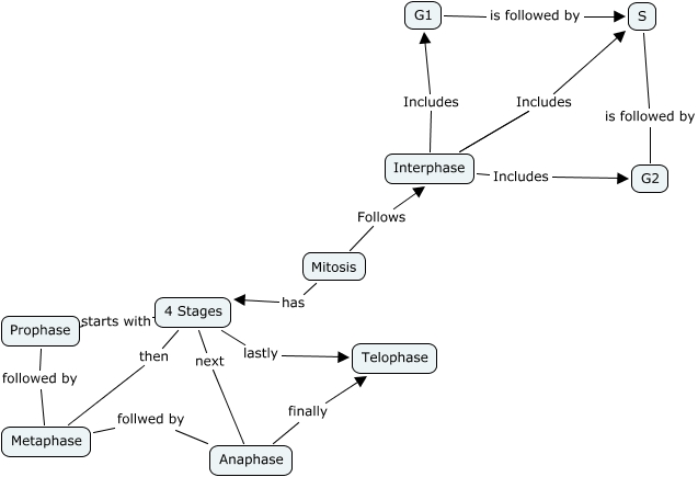This Concept Map, created with IHMC CmapTools, has information related to: Mitosis-kcd, Mitosis Follows Interphase, Mitosis has 4 Stages, G1 is followed by S, 4 Stages starts with Prophase, Interphase Includes G1, S is followed by G2, Interphase Includes G2, 4 Stages then Metaphase, Prophase followed by Metaphase, Metaphase follwed by Anaphase, 4 Stages lastly Telophase, Interphase Includes S, Anaphase finally Telophase, 4 Stages next Anaphase
