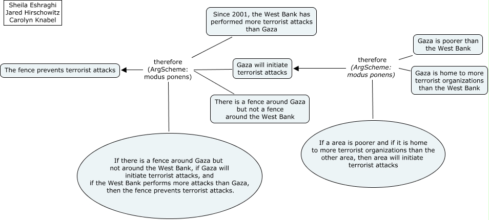 This Concept Map, created with IHMC CmapTools, has information related to: Group 5, Gaza is poorer than the West Bank therefore (ArgScheme: modus ponens) Gaza will initiate terrorist attacks, Gaza will initiate terrorist attacks therefore (ArgScheme: modus ponens) The fence prevents terrorist attacks, Gaza is home to more terrorist organizations than the West Bank therefore (ArgScheme: modus ponens) Gaza will initiate terrorist attacks, There is a fence around Gaza but not a fence around the West Bank therefore (ArgScheme: modus ponens) The fence prevents terrorist attacks, If there is a fence around Gaza but not around the West Bank, if Gaza will initiate terrorist attacks, and if the West Bank performs more attacks than Gaza, then the fence prevents terrorist attacks. therefore (ArgScheme: modus ponens) The fence prevents terrorist attacks, If a area is poorer and if it is home to more terrorist organizations than the other area, then area will initiate terrorist attacks therefore (ArgScheme: modus ponens) Gaza will initiate terrorist attacks, Since 2001, the West Bank has performed more terrorist attacks than Gaza therefore (ArgScheme: modus ponens) The fence prevents terrorist attacks