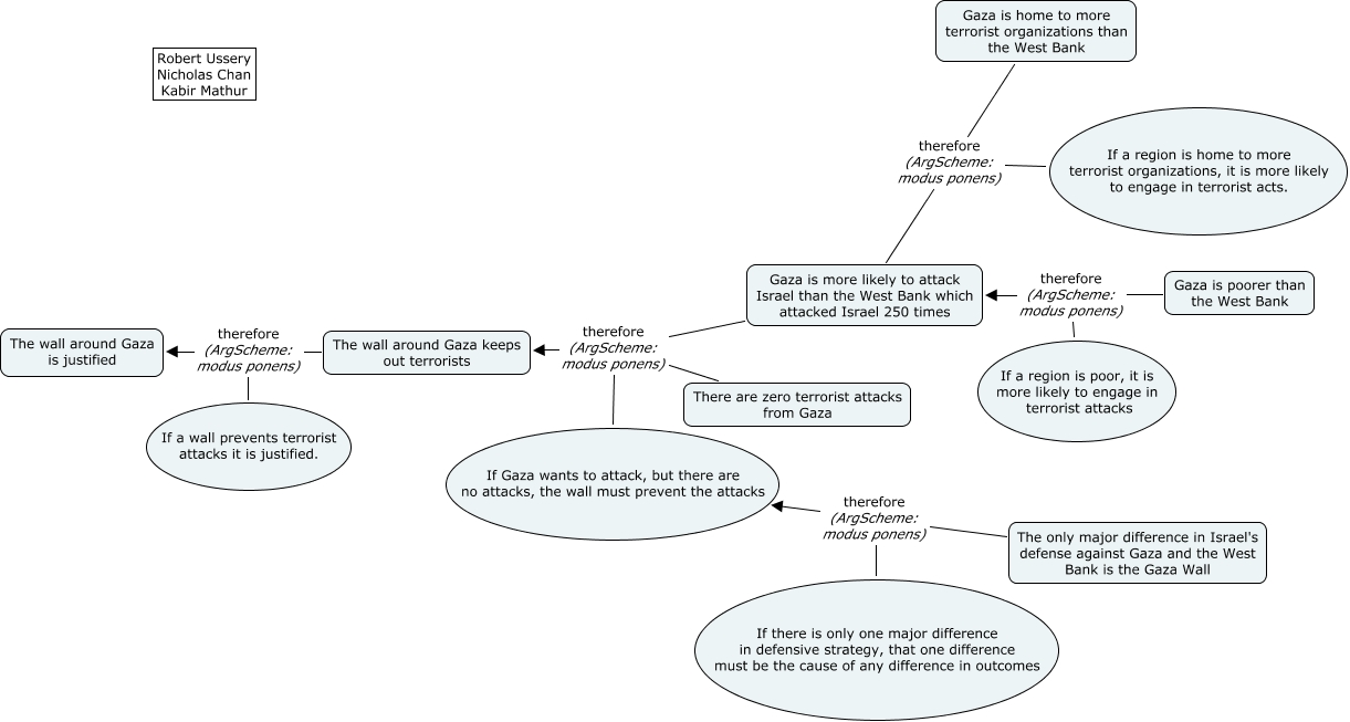This Concept Map, created with IHMC CmapTools, has information related to: Group 6, The only major difference in Israel's defense against Gaza and the West Bank is the Gaza Wall therefore (ArgScheme: modus ponens) If Gaza wants to attack, but there are no attacks, the wall must prevent the attacks, Gaza is more likely to attack Israel than the West Bank which attacked Israel 250 times therefore (ArgScheme: modus ponens) The wall around Gaza keeps out terrorists, If Gaza wants to attack, but there are no attacks, the wall must prevent the attacks therefore (ArgScheme: modus ponens) The wall around Gaza keeps out terrorists, Gaza is poorer than the West Bank therefore (ArgScheme: modus ponens) Gaza is more likely to attack Israel than the West Bank which attacked Israel 250 times, If a region is poor, it is more likely to engage in terrorist attacks therefore (ArgScheme: modus ponens) Gaza is more likely to attack Israel than the West Bank which attacked Israel 250 times, If a region is home to more terrorist organizations, it is more likely to engage in terrorist acts. therefore (ArgScheme: modus ponens) Gaza is more likely to attack Israel than the West Bank which attacked Israel 250 times, If a wall prevents terrorist attacks it is justified. therefore (ArgScheme: modus ponens) The wall around Gaza is justified, There are zero terrorist attacks from Gaza therefore (ArgScheme: modus ponens) The wall around Gaza keeps out terrorists, If there is only one major difference in defensive strategy, that one difference must be the cause of any difference in outcomes therefore (ArgScheme: modus ponens) If Gaza wants to attack, but there are no attacks, the wall must prevent the attacks, Gaza is home to more terrorist organizations than the West Bank therefore (ArgScheme: modus ponens) Gaza is more likely to attack Israel than the West Bank which attacked Israel 250 times, The wall around Gaza keeps out terrorists therefore (ArgScheme: modus ponens) The wall around Gaza is justified