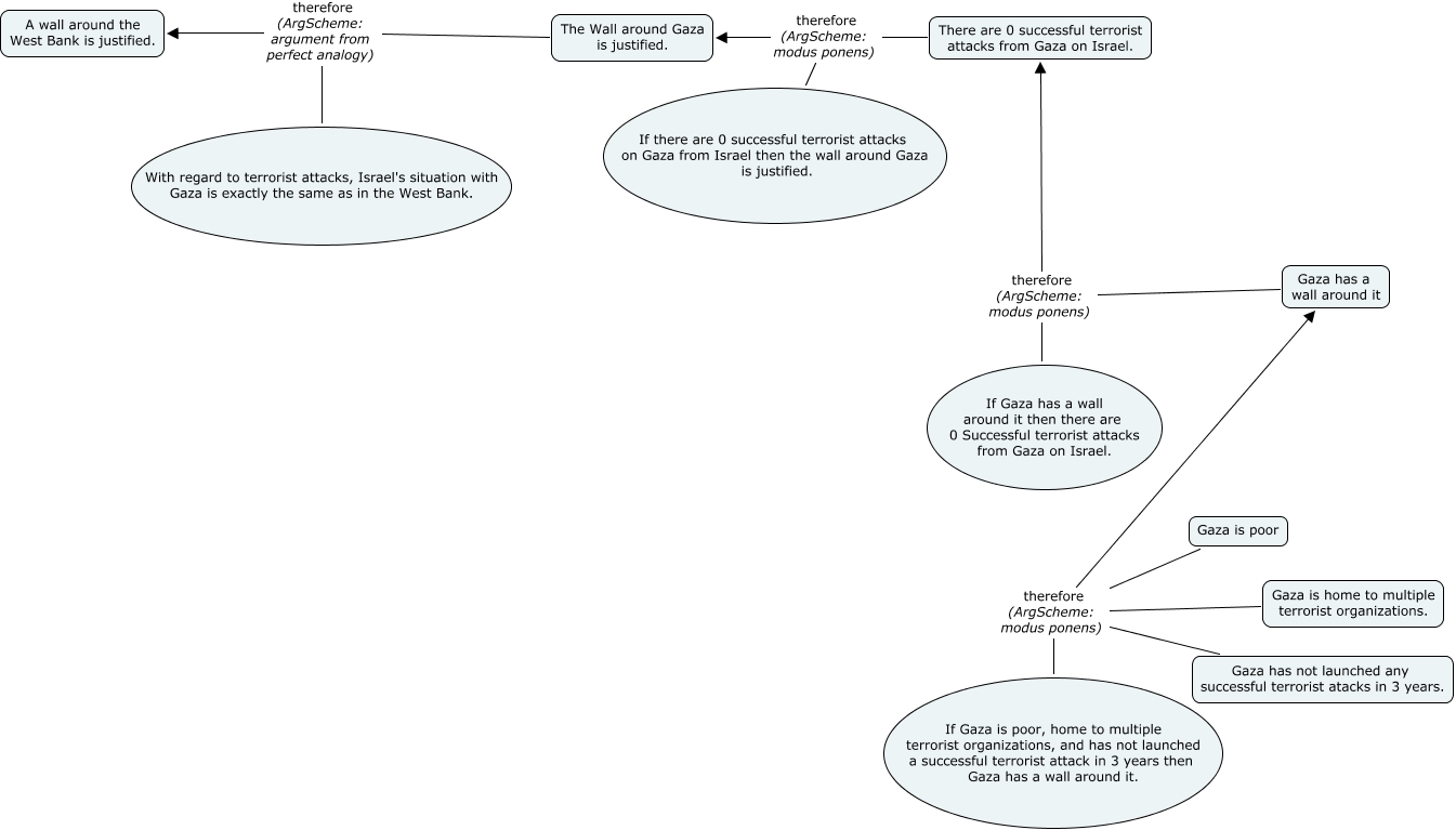 This Concept Map, created with IHMC CmapTools, has information related to: Group 8, Gaza has a wall around it therefore (ArgScheme: modus ponens) There are 0 successful terrorist attacks from Gaza on Israel., There are 0 successful terrorist attacks from Gaza on Israel. therefore (ArgScheme: modus ponens) The Wall around Gaza is justified., The Wall around Gaza is justified. therefore (ArgScheme: argument from perfect analogy) A wall around the West Bank is justified., If Gaza has a wall around it then there are 0 Successful terrorist attacks from Gaza on Israel. therefore (ArgScheme: modus ponens) There are 0 successful terrorist attacks from Gaza on Israel., Gaza has not launched any successful terrorist atacks in 3 years. therefore (ArgScheme: modus ponens) Gaza has a wall around it, Gaza is poor therefore (ArgScheme: modus ponens) Gaza has a wall around it, If there are 0 successful terrorist attacks on Gaza from Israel then the wall around Gaza is justified. therefore (ArgScheme: modus ponens) The Wall around Gaza is justified., With regard to terrorist attacks, Israel's situation with Gaza is exactly the same as in the West Bank. therefore (ArgScheme: argument from perfect analogy) A wall around the West Bank is justified., If Gaza is poor, home to multiple terrorist organizations, and has not launched a successful terrorist attack in 3 years then Gaza has a wall around it. therefore (ArgScheme: modus ponens) Gaza has a wall around it, Gaza is home to multiple terrorist organizations. therefore (ArgScheme: modus ponens) Gaza has a wall around it