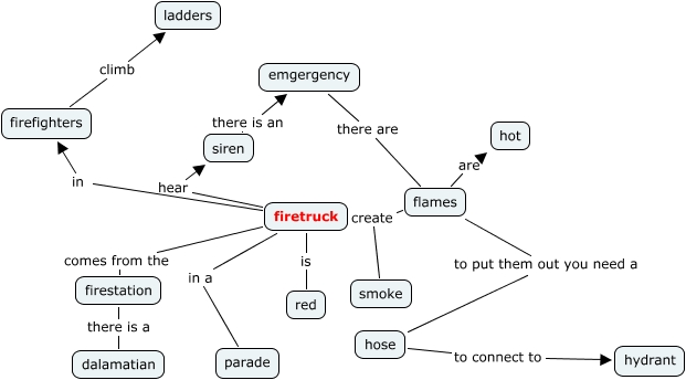 This Concept Map, created with IHMC CmapTools, has information related to: Firetruck1, firefighters climb ladders, flames to put them out you need a hose, firetruck in firefighters, flames create smoke, firetruck is red, firestation there is a dalamatian, emgergency there are flames, firetruck hear siren, firetruck in a parade, siren there is an emgergency, hose to connect to hydrant, flames are hot, firetruck comes from the firestation