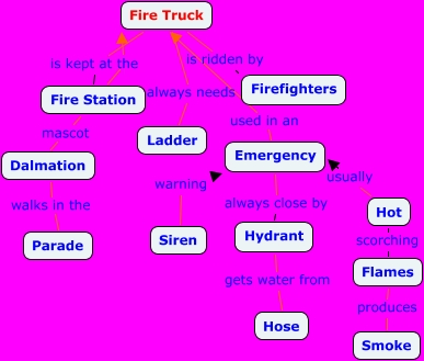 This Concept Map, created with IHMC CmapTools, has information related to: Fire Truck, Fire Truck is ridden by Firefighters, Fire Station Fire Truck, Hydrant gets water from Hose, Emergency used in an Fire Truck, Hot scorching Flames, Emergency always close by Hydrant, Dalmation walks in the Parade, Fire Truck always needs Ladder, Hot usually Emergency, Fire Station mascot Dalmation, Flames produces Smoke, Siren warning Emergency