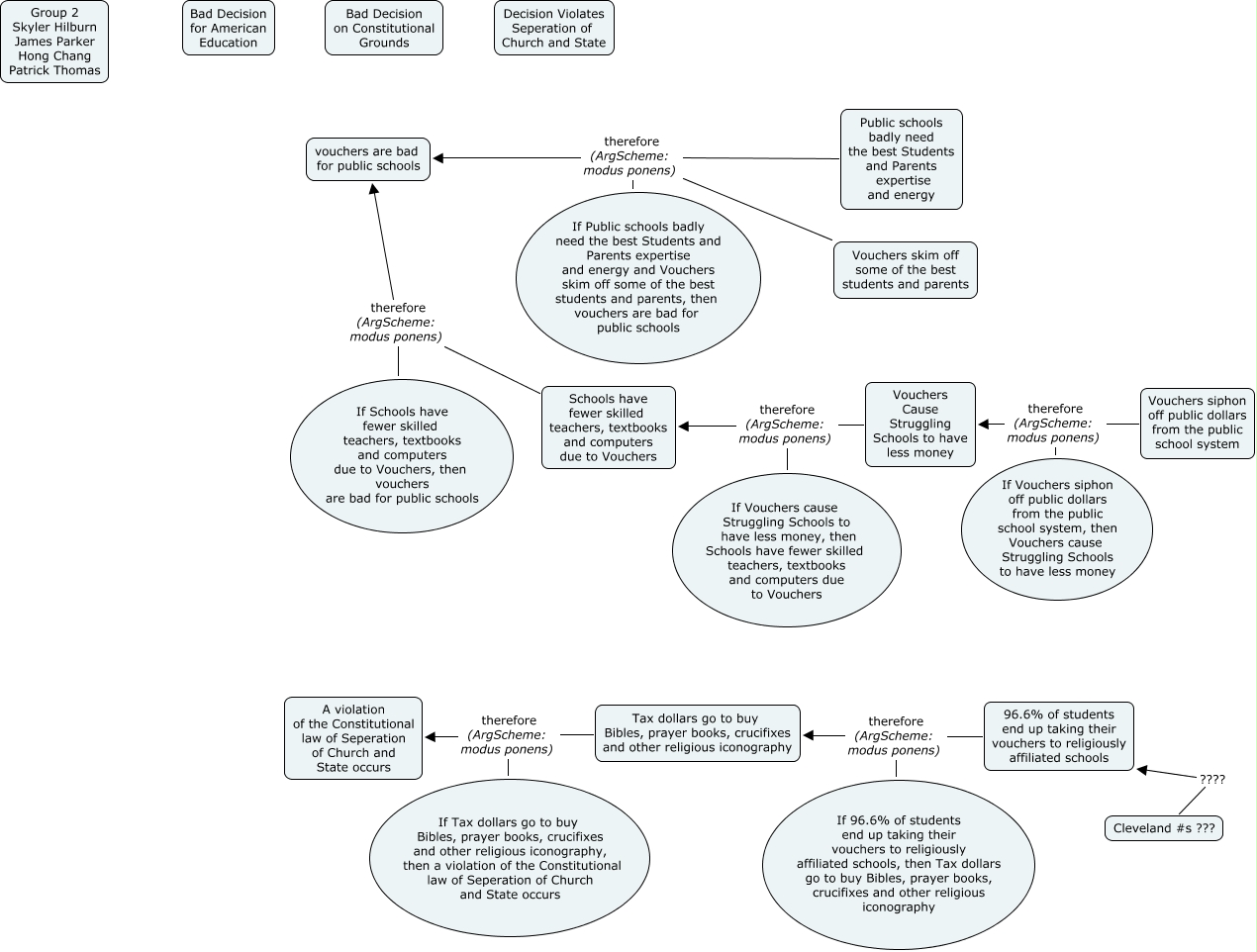This Concept Map, created with IHMC CmapTools, has information related to: Group 2 - 22 Jan, If Tax dollars go to buy Bibles, prayer books, crucifixes and other religious iconography, then a violation of the Constitutional law of Seperation of Church and State occurs therefore (ArgScheme: modus ponens) A violation of the Constitutional law of Seperation of Church and State occurs, If 96.6% of students end up taking their vouchers to religiously affiliated schools, then Tax dollars go to buy Bibles, prayer books, crucifixes and other religious iconography therefore (ArgScheme: modus ponens) Tax dollars go to buy Bibles, prayer books, crucifixes and other religious iconography, Public schools badly need the best Students and Parents expertise and energy therefore (ArgScheme: modus ponens) vouchers are bad for public schools, If Public schools badly need the best Students and Parents expertise and energy and Vouchers skim off some of the best students and parents, then vouchers are bad for public schools therefore (ArgScheme: modus ponens) vouchers are bad for public schools, 96.6% of students end up taking their vouchers to religiously affiliated schools therefore (ArgScheme: modus ponens) Tax dollars go to buy Bibles, prayer books, crucifixes and other religious iconography, Tax dollars go to buy Bibles, prayer books, crucifixes and other religious iconography therefore (ArgScheme: modus ponens) A violation of the Constitutional law of Seperation of Church and State occurs, If Schools have fewer skilled teachers, textbooks and computers due to Vouchers, then vouchers are bad for public schools therefore (ArgScheme: modus ponens) vouchers are bad for public schools, If Vouchers siphon off public dollars from the public school system, then Vouchers cause Struggling Schools to have less money therefore (ArgScheme: modus ponens) Vouchers Cause Struggling Schools to have less money, Cleveland #s ??? ???? 96.6% of students end up taking their vouchers to religiously affiliated schools, Vouchers skim off some of the best students and parents therefore (ArgScheme: modus ponens) vouchers are bad for public schools, Vouchers siphon off public dollars from the public school system therefore (ArgScheme: modus ponens) Vouchers Cause Struggling Schools to have less money, If Vouchers cause Struggling Schools to have less money, then Schools have fewer skilled teachers, textbooks and computers due to Vouchers therefore (ArgScheme: modus ponens) Schools have fewer skilled teachers, textbooks and computers due to Vouchers, Schools have fewer skilled teachers, textbooks and computers due to Vouchers therefore (ArgScheme: modus ponens) vouchers are bad for public schools, Vouchers Cause Struggling Schools to have less money therefore (ArgScheme: modus ponens) Schools have fewer skilled teachers, textbooks and computers due to Vouchers