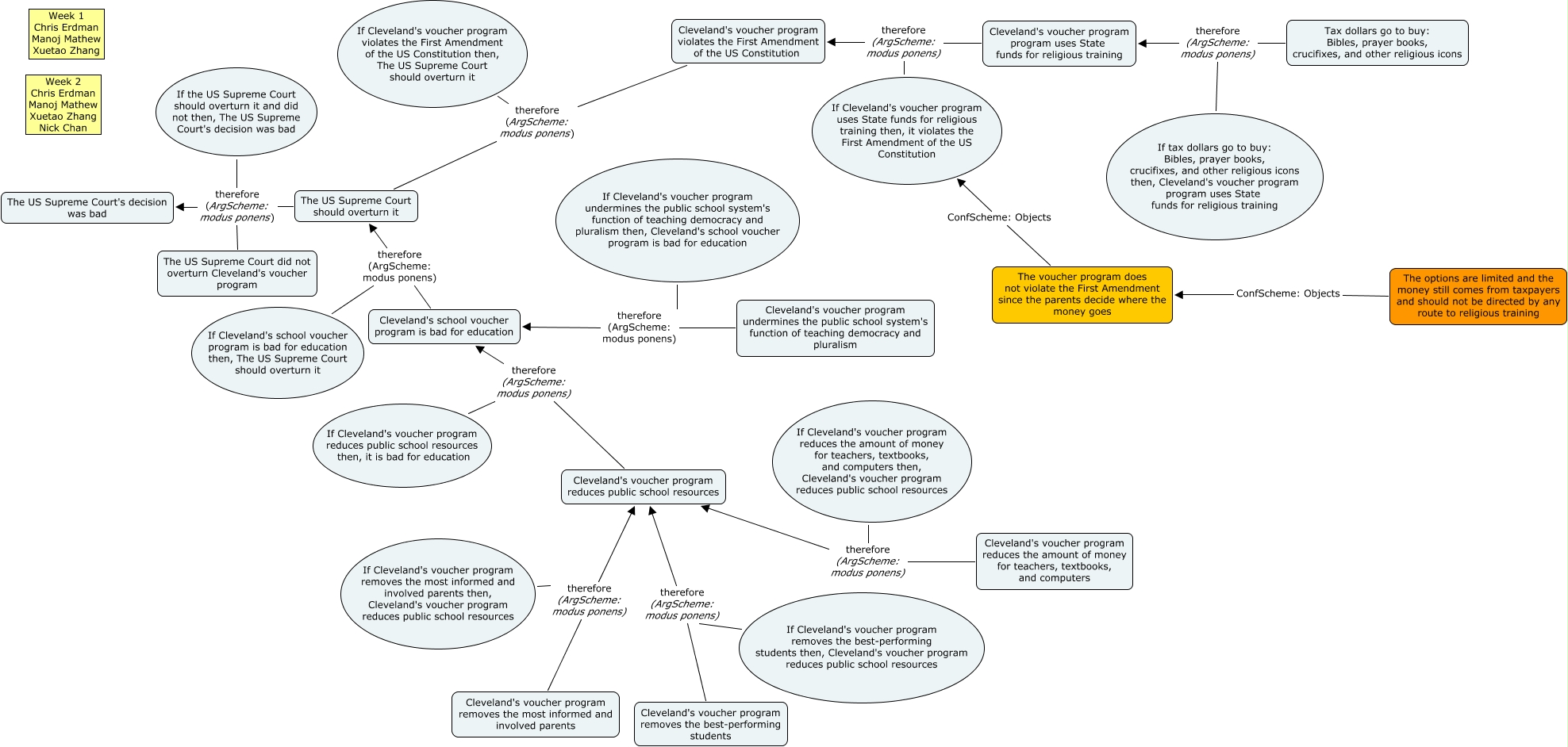 This Concept Map, created with IHMC CmapTools, has information related to: Group 4, If tax dollars go to buy: Bibles, prayer books, crucifixes, and other religious icons then, Cleveland's voucher program program uses State funds for religious training therefore (ArgScheme: modus ponens) Cleveland's voucher program program uses State funds for religious training, If the US Supreme Court should overturn it and did not then, The US Supreme Court's decision was bad therefore (ArgScheme: modus ponens) The US Supreme Court's decision was bad, If Cleveland's school voucher program is bad for education then, The US Supreme Court should overturn it therefore (ArgScheme: modus ponens) The US Supreme Court should overturn it, The options are limited and the money still comes from taxpayers and should not be directed by any route to religious training ConfScheme: Objects The voucher program does not violate the First Amendment since the parents decide where the money goes, If Cleveland's voucher program reduces the amount of money for teachers, textbooks, and computers then, Cleveland's voucher program reduces public school resources therefore (ArgScheme: modus ponens) Cleveland's voucher program reduces public school resources, If Cleveland's voucher program removes the most informed and involved parents then, Cleveland's voucher program reduces public school resources therefore (ArgScheme: modus ponens) Cleveland's voucher program reduces public school resources, Cleveland's voucher program program uses State funds for religious training therefore (ArgScheme: modus ponens) Cleveland's voucher program violates the First Amendment of the US Constitution, If Cleveland's voucher program undermines the public school system's function of teaching democracy and pluralism then, Cleveland's school voucher program is bad for education therefore (ArgScheme: modus ponens) Cleveland's school voucher program is bad for education, The US Supreme Court did not overturn Cleveland's voucher program therefore (ArgScheme: modus ponens) The US Supreme Court's decision was bad, Cleveland's voucher program violates the First Amendment of the US Constitution therefore (ArgScheme: modus ponens) The US Supreme Court should overturn it, Cleveland's voucher program removes the most informed and involved parents therefore (ArgScheme: modus ponens) Cleveland's voucher program reduces public school resources, The US Supreme Court should overturn it therefore (ArgScheme: modus ponens) The US Supreme Court's decision was bad, The voucher program does not violate the First Amendment since the parents decide where the money goes ConfScheme: Objects If Cleveland's voucher program uses State funds for religious training then, it violates the First Amendment of the US Constitution, Tax dollars go to buy: Bibles, prayer books, crucifixes, and other religious icons therefore (ArgScheme: modus ponens) Cleveland's voucher program program uses State funds for religious training, Cleveland's school voucher program is bad for education therefore (ArgScheme: modus ponens) The US Supreme Court should overturn it, Cleveland's voucher program reduces the amount of money for teachers, textbooks, and computers therefore (ArgScheme: modus ponens) Cleveland's voucher program reduces public school resources, Cleveland's voucher program undermines the public school system's function of teaching democracy and pluralism therefore (ArgScheme: modus ponens) Cleveland's school voucher program is bad for education, If Cleveland's voucher program violates the First Amendment of the US Constitution then, The US Supreme Court should overturn it therefore (ArgScheme: modus ponens) The US Supreme Court should overturn it, If Cleveland's voucher program removes the best-performing students then, Cleveland's voucher program reduces public school resources therefore (ArgScheme: modus ponens) Cleveland's voucher program reduces public school resources, If Cleveland's voucher program uses State funds for religious training then, it violates the First Amendment of the US Constitution therefore (ArgScheme: modus ponens) Cleveland's voucher program violates the First Amendment of the US Constitution