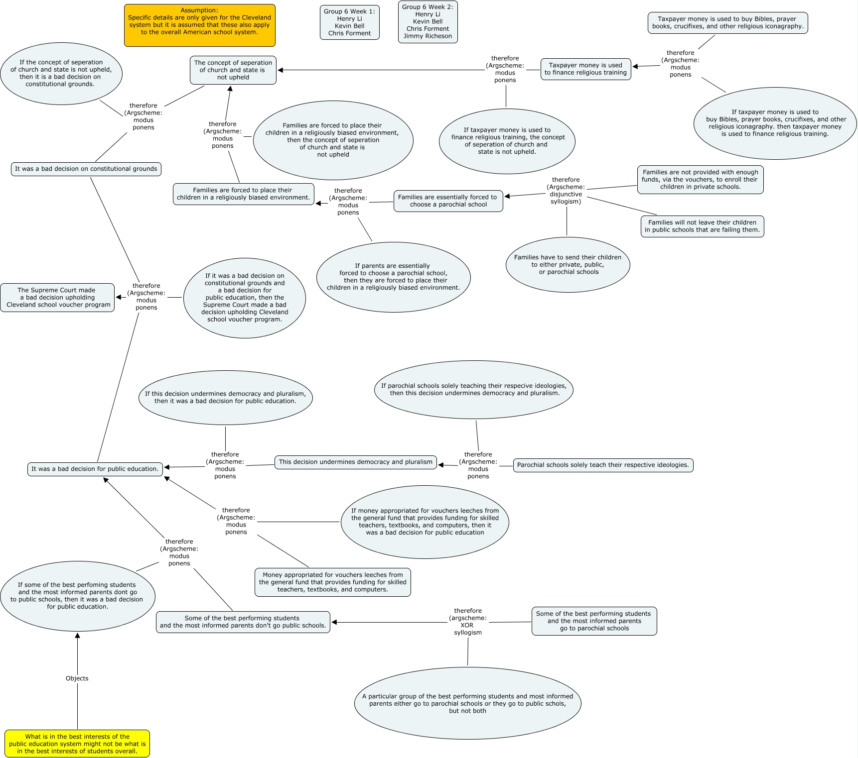 This Concept Map, created with IHMC CmapTools, has information related to: Group 6-Essay 3 Assignment, Families are essentially forced to choose a parochial school therefore (Argscheme: modus ponens Families are forced to place their children in a religiously biased environment., Taxpayer money is used to buy Bibles, prayer books, crucifixes, and other religious iconagraphy. therefore (Argscheme: modus ponens Taxpayer money is used to finance religious training, The concept of seperation of church and state is not upheld therefore (Argscheme: modus ponens It was a bad decision on constitutional grounds, If money appropriated for vouchers leeches from the general fund that provides funding for skilled teachers, textbooks, and computers, then it was a bad decision for public education therefore (Argscheme: modus ponens It was a bad decision for public education., If it was a bad decision on constitutional grounds and a bad decision for public education, then the Supreme Court made a bad decision upholding Cleveland school voucher program. therefore (Argscheme: modus ponens The Supreme Court made a bad decision upholding Cleveland school voucher program, If the concept of seperation of church and state is not upheld, then it is a bad decision on constitutional grounds. therefore (Argscheme: modus ponens It was a bad decision on constitutional grounds, What is in the best interests of the public education system might not be what is in the best interests of students overall. Objects If some of the best perfoming students and the most informed parents dont go to public schools, then it was a bad decision for public education., If some of the best perfoming students and the most informed parents dont go to public schools, then it was a bad decision for public education. therefore (Argscheme: modus ponens It was a bad decision for public education., Some of the best performing students and the most informed parents go to parochial schools therefore (argscheme: XOR syllogism Some of the best performing students and the most informed parents don't go public schools., Families are forced to place their children in a religiously biased environment, then the concept of seperation of church and state is not upheld therefore (Argscheme: modus ponens The concept of seperation of church and state is not upheld, If taxpayer money is used to buy Bibles, prayer books, crucifixes, and other religious iconagraphy. then taxpayer money is used to finance religious training. therefore (Argscheme: modus ponens Taxpayer money is used to finance religious training, Families will not leave their children in public schools that are failing them. therefore (Argscheme: disjunctive syllogism) Families are essentially forced to choose a parochial school, If parents are essentially forced to choose a parochial school, then they are forced to place their children in a religiously biased environment. therefore (Argscheme: modus ponens Families are forced to place their children in a religiously biased environment., Families have to send their children to either private, public, or parochial schools therefore (Argscheme: disjunctive syllogism) Families are essentially forced to choose a parochial school, If this decision undermines democracy and pluralism, then it was a bad decision for public education. therefore (Argscheme: modus ponens It was a bad decision for public education., Some of the best performing students and the most informed parents don't go public schools. therefore (Argscheme: modus ponens It was a bad decision for public education., If taxpayer money is used to finance religious training, the concept of seperation of church and state is not upheld. therefore (Argscheme: modus ponens The concept of seperation of church and state is not upheld, This decision undermines democracy and pluralism therefore (Argscheme: modus ponens It was a bad decision for public education., Money appropriated for vouchers leeches from the general fund that provides funding for skilled teachers, textbooks, and computers. therefore (Argscheme: modus ponens It was a bad decision for public education., It was a bad decision for public education. therefore (Argscheme: modus ponens The Supreme Court made a bad decision upholding Cleveland school voucher program