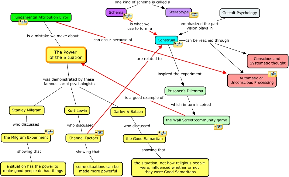 This Concept Map, created with IHMC CmapTools, has information related to: Power of the Situation 2, Stanley Milgram who discussed the Milgram Experiment, the Good Samaritan showing that the situation, not how religious people were, influenced whether or not they were Good Samaritans, Channel Factors showing that some situations can be made more powerful, Construal can be reached through Automatic or Unconscious Processing, Schema one kind of schema is called a Stereotype, Prisoner's Dilemma which in turn inspired the Wall Street:community game, Channel Factors are related to Construal, The Power of the Situation was demonstrated by these famous social psychologists Darley & Batson, the Wall Street:community game is a good example of The Power of the Situation, Fundamental Attribution Error can occur because of Automatic or Unconscious Processing, Kurt Lewin who discussed Channel Factors, Schema is what we use to form a Construal, the Milgram Experiment showing that a situation has the power to make good people do bad things, Construal can be reached through Conscious and Systematic thought, The Power of the Situation is a mistake we make about Fundamental Attribution Error, Gestalt Psychology emphasized the part vision plays in Construal, Darley & Batson who discussed the Good Samaritan, The Power of the Situation was demonstrated by these famous social psychologists Stanley Milgram, The Power of the Situation was demonstrated by these famous social psychologists Kurt Lewin, Construal inspired the experiment Prisoner's Dilemma