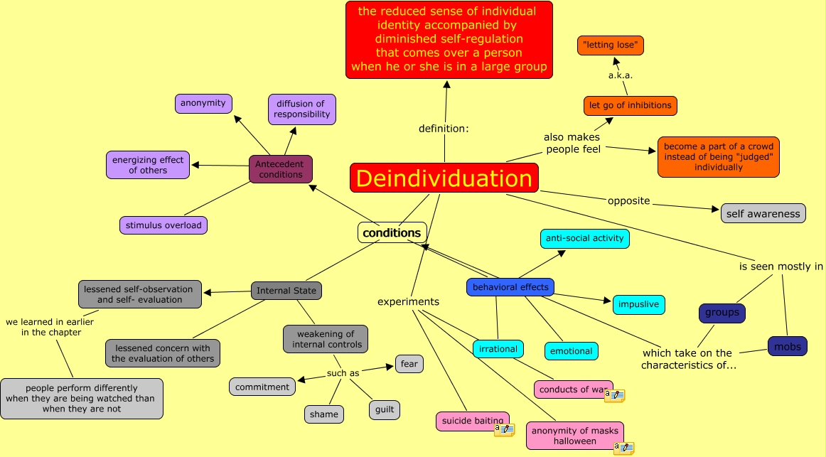 This Concept Map, created with IHMC CmapTools, has information related to: Deindividuation, behavioral effects ???? impuslive, Antecedent conditions ???? energizing effect of others, Internal State ???? lessened concern with the evaluation of others, Deindividuation experiments anonymity of masks halloween, groups which take on the characteristics of... conditions, behavioral effects ???? irrational, weakening of internal controls such as fear, weakening of internal controls such as shame, Deindividuation is seen mostly in mobs, Deindividuation also makes people feel let go of inhibitions, Deindividuation conditions Internal State, Deindividuation is seen mostly in groups, Deindividuation conditions Antecedent conditions, let go of inhibitions a.k.a. "letting lose", Antecedent conditions ???? anonymity, Antecedent conditions ???? diffusion of responsibility, Deindividuation opposite self awareness, mobs which take on the characteristics of... conditions, Deindividuation definition: the reduced sense of individual identity accompanied by diminished self-regulation that comes over a person when he or she is in a large group, Internal State ???? lessened self-observation and self- evaluation