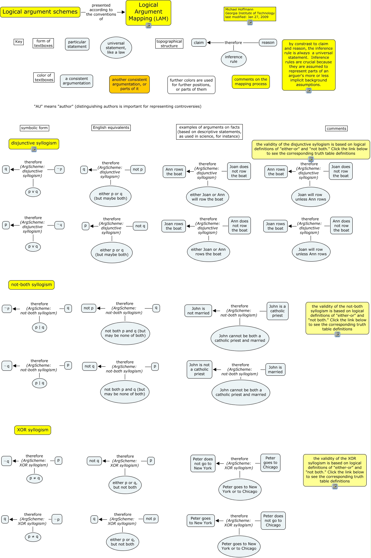 This Concept Map, created with IHMC CmapTools, has information related to: Copy of disjunctive not-both xor syllogism, p v q therefore (ArgScheme: disjunctive syllogism) q, inference rule therefore claim, either p or q (but maybe both) therefore (ArgScheme: disjunctive syllogism) p, either Joan or Ann rows the boat therefore (ArgScheme: disjunctive syllogism) Ann does not row the boat, not both p and q (but may be none of both) therefore (ArgScheme: not-both syllogism) not p, p ≠ q therefore (ArgScheme: XOR syllogism) q, reason therefore claim, Peter goes to New York or to Chicago therefore (ArgScheme: XOR syllogism) Peter does not go to New York, Peter does not go to Chicago therefore (ArgScheme: XOR syllogism) Peter goes to New York, not both p and q (but may be none of both) therefore (ArgScheme: not-both syllogism) q, p therefore (ArgScheme: not-both syllogism) ¬ q, q therefore (ArgScheme: not-both syllogism) ¬ p, p | q therefore (ArgScheme: not-both syllogism) ¬ p, either p or q, but not both therefore (ArgScheme: XOR syllogism) p, either p or q, but not both therefore (ArgScheme: XOR syllogism) not q, p | q therefore (ArgScheme: not-both syllogism) ¬ q, not both p and q (but may be none of both) therefore (ArgScheme: not-both syllogism) p, p therefore (ArgScheme: XOR syllogism) ¬ q, John cannot be both a catholic priest and married therefore (ArgScheme: not-both syllogism) John is not a catholic priest, ¬ p therefore (ArgScheme: disjunctive syllogism) q