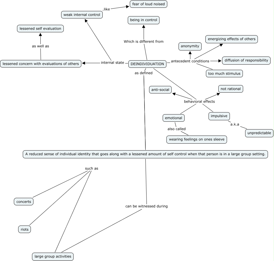 This Concept Map, created with IHMC CmapTools, has information related to: Deindividuation, DEINDIVIDUATION behavioral effects anti-social, large group activities such as riots, weak internal control like fear of loud noised, DEINDIVIDUATION behavioral effects emotional, DEINDIVIDUATION internal state weak internal control, large group activities such as concerts, DEINDIVIDUATION as defined A reduced sense of individual identity that goes along with a lessened amount of self control when that person is in a large group setting., A reduced sense of individual identity that goes along with a lessened amount of self control when that person is in a large group setting. can be witnessed during large group activities, lessened concern with evaluations of others as well as lessened self evaluation, DEINDIVIDUATION behavioral effects not rational, impulsive a.k.a unpredictable, DEINDIVIDUATION Which is different from being in control, DEINDIVIDUATION antecedent conditions energizing effects of others, DEINDIVIDUATION antecedent conditions anonymity, DEINDIVIDUATION internal state lessened concern with evaluations of others, DEINDIVIDUATION antecedent conditions diffusion of responsibility, emotional also called wearing feelings on ones sleeve, DEINDIVIDUATION antecedent conditions too much stimulus, DEINDIVIDUATION behavioral effects impulsive