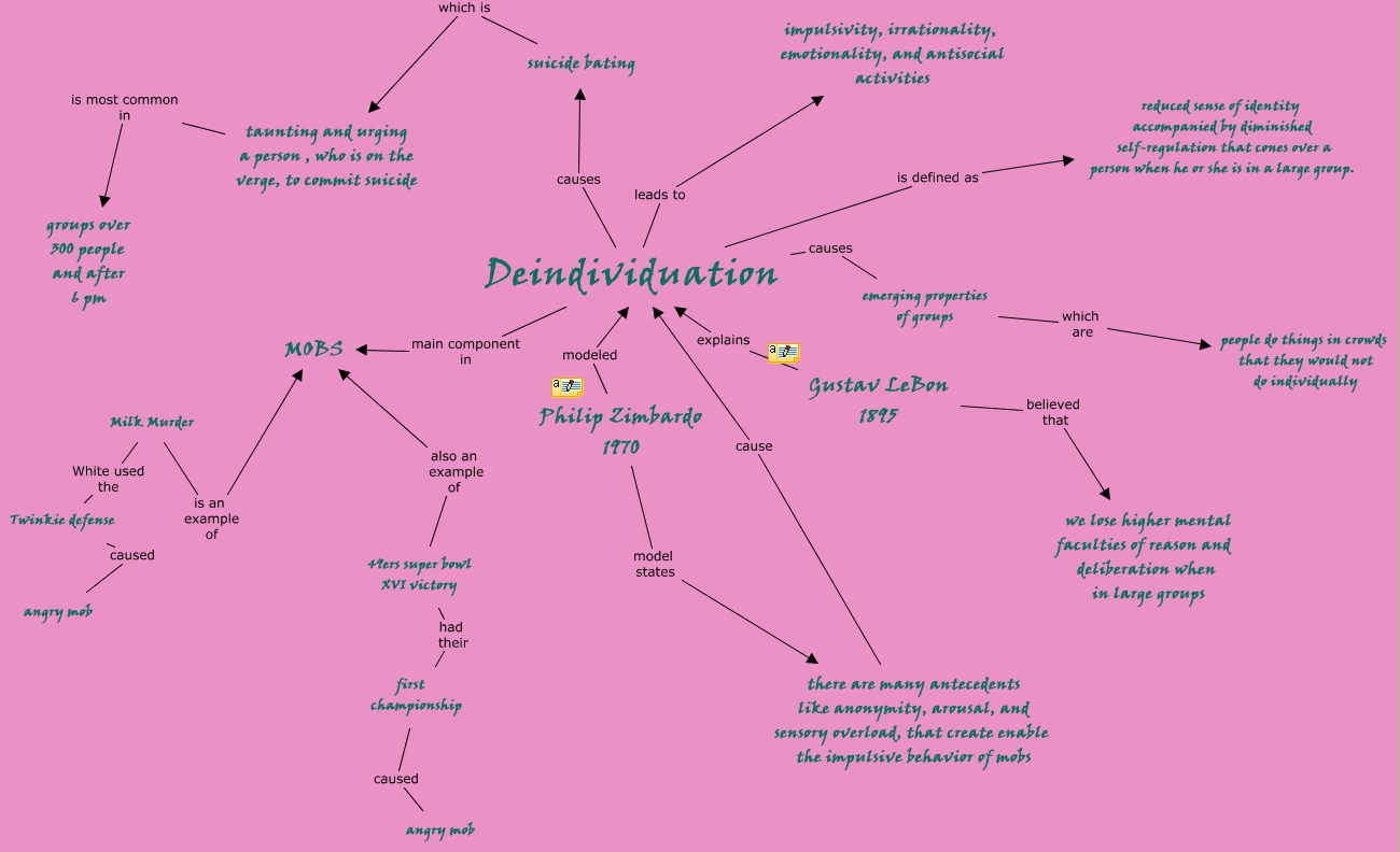 This Concept Map, created with IHMC CmapTools, has information related to: Deindividuation, emerging properties of groups which are people do things in crowds that they would not do individually, Deindividuation main component in MOBS, Deindividuation is defined as reduced sense of identity accompanied by diminished self-regulation that cones over a person when he or she is in a large group., 49ers super bowl XVI victory had their first championship, Deindividuation causes suicide bating, taunting and urging a person , who is on the verge, to commit suicide is most common in groups over 300 people and after 6 pm, suicide bating which is taunting and urging a person , who is on the verge, to commit suicide, there are many antecedents like anonymity, arousal, and sensory overload, that create enable the impulsive behavior of mobs cause Deindividuation, Philip Zimbardo 1970 modeled Deindividuation, Deindividuation leads to impulsivity, irrationality, emotionality, and antisocial activities, Gustav LeBon 1895 explains Deindividuation, Milk Murder is an example of MOBS, 49ers super bowl XVI victory also an example of MOBS, Deindividuation causes emerging properties of groups, Gustav LeBon 1895 believed that we lose higher mental faculties of reason and deliberation when in large groups, Philip Zimbardo 1970 model states there are many antecedents like anonymity, arousal, and sensory overload, that create enable the impulsive behavior of mobs, Twinkie defense caused angry mob, first championship caused angry mob, Milk Murder White used the Twinkie defense