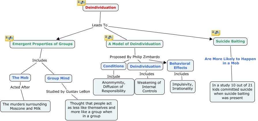 This Concept Map, created with IHMC CmapTools, has information related to: Deindividuation, A Model of Deindividuation Proposed By Philip Zimbardo Conditions, A Model of Deindividuation Proposed By Philip Zimbardo Behavioral Effects, Deindividuation Includes Weakening of Internal Controls, Deindividuation Leads To A Model of Deindividuation, Suicide Baiting Are More Likely to Happen in a Mob In a study 10 out of 21 kids committed suicide when suicide baiting was present, Emergent Properties of Groups Includes The Mob, Group Mind Studied by Gustav LeBon Thought that people act as less like themselves and more like a group when in a group, A Model of Deindividuation Proposed By Philip Zimbardo Deindividuation, Behavioral Effects Includes Impulsivity, Irrationality, Emergent Properties of Groups Includes Group Mind, Conditions Include Anonmymity, Diffusion of Responsibility, Deindividuation Leads To Emergent Properties of Groups, Deindividuation Leads To Suicide Baiting, The Mob Acted After The murders surrounding Moscone and Milk
