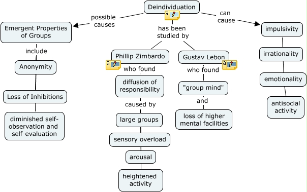 This Concept Map, created with IHMC CmapTools, has information related to: Deindividuation, Emergent Properties of Groups include Anonymity, Deindividuation has been studied by Gustav Lebon, diffusion of responsibility caused by large groups, Deindividuation possible causes Emergent Properties of Groups, Gustav Lebon who found "group mind", impulsivity ???? antisocial activity, diffusion of responsibility caused by heightened activity, Phillip Zimbardo who found diffusion of responsibility, Deindividuation can cause impulsivity, diffusion of responsibility caused by sensory overload, Emergent Properties of Groups include Loss of Inhibitions, Deindividuation has been studied by Phillip Zimbardo, "group mind" and loss of higher mental facilities, Emergent Properties of Groups include diminished self- observation and self-evaluation, diffusion of responsibility caused by arousal