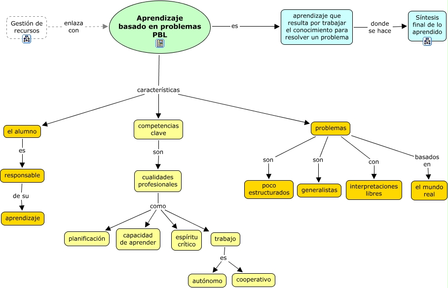 Este Cmap, tiene información relacionada con: Aprendizaje basado en problemas PBL, Aprendizaje basado en problemas PBL características competencias clave, competencias clave son cualidades profesionales, cualidades profesionales como trabajo, Gestión de recursos enlaza con Aprendizaje basado en problemas PBL, Aprendizaje basado en problemas PBL características problemas, Aprendizaje basado en problemas PBL características el alumno, responsable de su aprendizaje, problemas con interpretaciones libres, problemas son poco estructurados, cualidades profesionales como espíritu crítico, trabajo es cooperativo, cualidades profesionales como capacidad de aprender, problemas son generalistas, el alumno es responsable, aprendizaje que resulta por trabajar el conocimiento para resolver un problema donde se hace Síntesis final de lo aprendido, problemas basados en el mundo real, trabajo es autónomo, cualidades profesionales como planificación, Aprendizaje basado en problemas PBL es aprendizaje que resulta por trabajar el conocimiento para resolver un problema