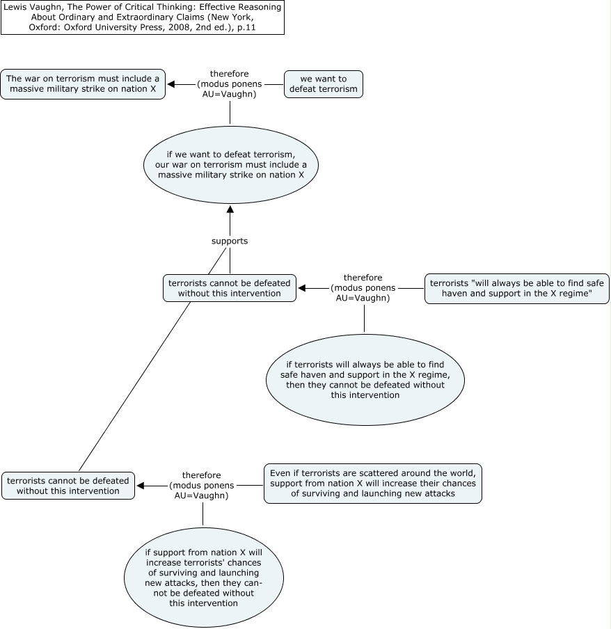 This Concept Map, created with IHMC CmapTools, has information related to: Ex p.11-Vaughn on terrorism, terrorists "will always be able to find safe haven and support in the X regime" therefore (modus ponens AU=Vaughn) terrorists cannot be defeated without this intervention, we want to defeat terrorism therefore (modus ponens AU=Vaughn) The war on terrorism must include a massive military strike on nation X, if support from nation X will increase terrorists' chances of surviving and launching new attacks, then they can- not be defeated without this intervention therefore (modus ponens AU=Vaughn) terrorists cannot be defeated without this intervention, Even if terrorists are scattered around the world, support from nation X will increase their chances of surviving and launching new attacks therefore (modus ponens AU=Vaughn) terrorists cannot be defeated without this intervention, terrorists cannot be defeated without this intervention supports if we want to defeat terrorism, our war on terrorism must include a massive military strike on nation X, if we want to defeat terrorism, our war on terrorism must include a massive military strike on nation X therefore (modus ponens AU=Vaughn) The war on terrorism must include a massive military strike on nation X, terrorists cannot be defeated without this intervention supports if we want to defeat terrorism, our war on terrorism must include a massive military strike on nation X, if terrorists will always be able to find safe haven and support in the X regime, then they cannot be defeated without this intervention therefore (modus ponens AU=Vaughn) terrorists cannot be defeated without this intervention