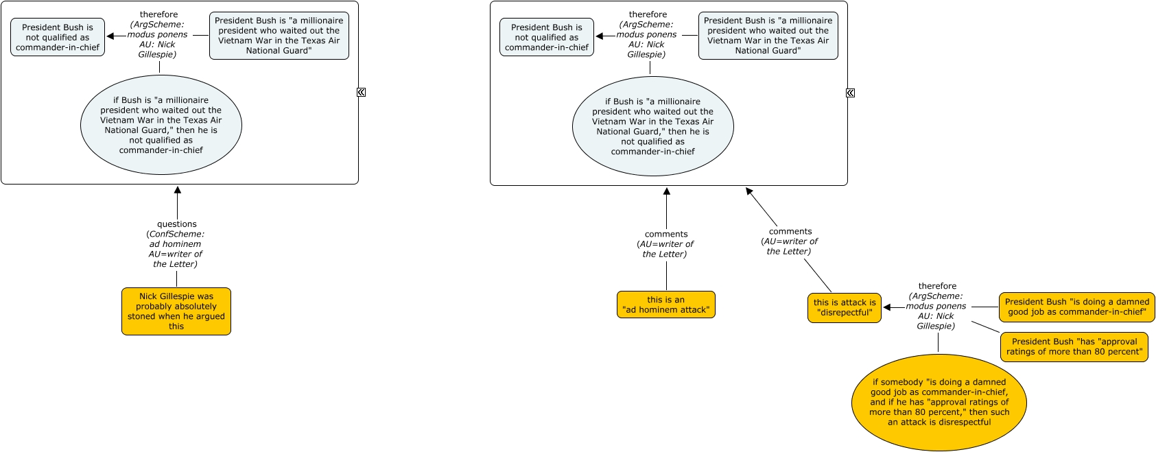 This Concept Map, created with IHMC CmapTools, has information related to: Ex. 3.10.2 Nick Gillespie against Bush, if somebody "is doing a damned good job as commander-in-chief, and if he has "approval ratings of more than 80 percent," then such an attack is disrespectful therefore (ArgScheme: modus ponens AU: Nick Gillespie) this is attack is "disrepectful", President Bush is "a millionaire president who waited out the Vietnam War in the Texas Air National Guard" therefore (ArgScheme: modus ponens AU: Nick Gillespie) President Bush is not qualified as commander-in-chief, this is attack is "disrepectful" comments (AU=writer of the Letter) ????, if Bush is "a millionaire president who waited out the Vietnam War in the Texas Air National Guard," then he is not qualified as commander-in-chief therefore (ArgScheme: modus ponens AU: Nick Gillespie) President Bush is not qualified as commander-in-chief, Nick Gillespie was probably absolutely stoned when he argued this questions (ConfScheme: ad hominem AU=writer of the Letter) ????, if Bush is "a millionaire president who waited out the Vietnam War in the Texas Air National Guard," then he is not qualified as commander-in-chief therefore (ArgScheme: modus ponens AU: Nick Gillespie) President Bush is not qualified as commander-in-chief, this is an "ad hominem attack" comments (AU=writer of the Letter) ????, President Bush is "a millionaire president who waited out the Vietnam War in the Texas Air National Guard" therefore (ArgScheme: modus ponens AU: Nick Gillespie) President Bush is not qualified as commander-in-chief, President Bush "is doing a damned good job as commander-in-chief" therefore (ArgScheme: modus ponens AU: Nick Gillespie) this is attack is "disrepectful", President Bush "has "approval ratings of more than 80 percent" therefore (ArgScheme: modus ponens AU: Nick Gillespie) this is attack is "disrepectful"