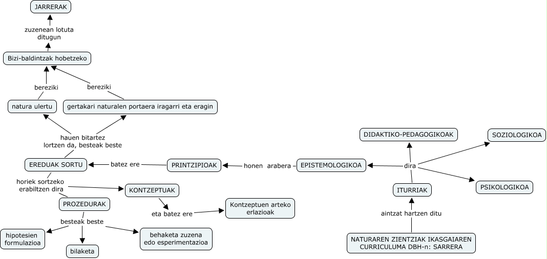 Este Cmap, tiene información relacionada con: Natur Zientziak ikasgaiaren curriculuma DBH-n. Sarrera, ITURRIAK dira EPISTEMOLOGIKOA, PRINTZIPIOAK batez ere EREDUAK SORTU, EPISTEMOLOGIKOA honen arabera PRINTZIPIOAK, NATURAREN ZIENTZIAK IKASGAIAREN CURRICULUMA DBH-n: SARRERA aintzat hartzen ditu ITURRIAK, gertakari naturalen portaera iragarri eta eragin bereziki Bizi-baldintzak hobetzeko, EREDUAK SORTU horiek sortzeko erabiltzen dira PROZEDURAK, PROZEDURAK besteak beste bilaketa, EREDUAK SORTU hauen bitartez lortzen da, besteak beste natura ulertu, KONTZEPTUAK eta batez ere Kontzeptuen arteko erlazioak, Bizi-baldintzak hobetzeko zuzenean lotuta ditugun JARRERAK, ITURRIAK dira PSIKOLOGIKOA, natura ulertu bereziki Bizi-baldintzak hobetzeko, PROZEDURAK besteak beste hipotesien formulazioa, EREDUAK SORTU horiek sortzeko erabiltzen dira KONTZEPTUAK, EREDUAK SORTU hauen bitartez lortzen da, besteak beste gertakari naturalen portaera iragarri eta eragin, ITURRIAK dira SOZIOLOGIKOA, PROZEDURAK besteak beste behaketa zuzena edo esperimentazioa, ITURRIAK dira DIDAKTIKO-PEDAGOGIKOAK