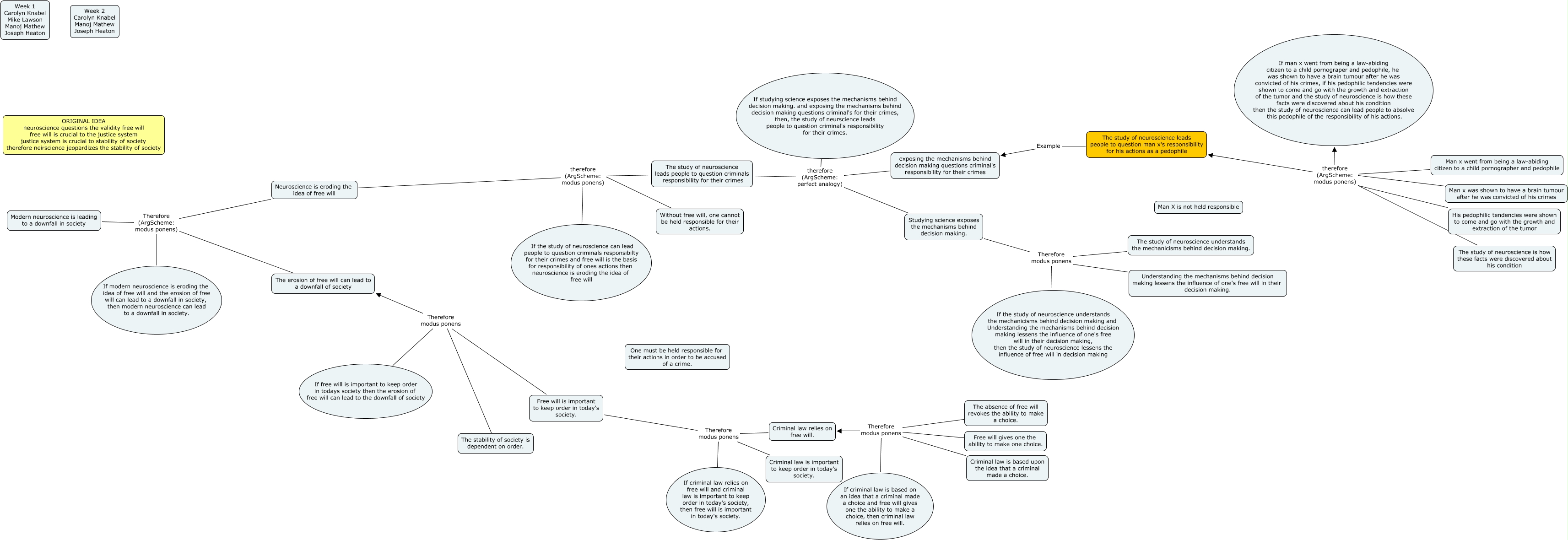 This Concept Map, created with IHMC CmapTools, has information related to: Group 8, Criminal law relies on free will. Therefore modus ponens If criminal law relies on free will and criminal law is important to keep order in today's society, then free will is important in today's society., Criminal law is based upon the idea that a criminal made a choice. Therefore modus ponens If criminal law is based on an idea that a criminal made a choice and free will gives one the ability to make a choice, then criminal law relies on free will., The stability of society is dependent on order. Therefore modus ponens If free will is important to keep order in todays society then the erosion of free will can lead to the downfall of society, exposing the mechanisms behind decision making questions criminal's responsibility for their crimes therefore (ArgScheme: perfect analogy) If studying science exposes the mechanisms behind decision making. and exposing the mechanisms behind decision making questions criminal's for their crimes, then, the study of neurscience leads people to question criminal's responsibility for their crimes., Studying science exposes the mechanisms behind decision making. therefore (ArgScheme: perfect analogy) The study of neuroscience leads people to question criminals responsibility for their crimes, The erosion of free will can lead to a downfall of society Therefore (ArgScheme: modus ponens) If modern neuroscience is eroding the idea of free will and the erosion of free will can lead to a downfall in society, then modern neuroscience can lead to a downfall in society., Without free will, one cannot be held responsible for their actions. therefore (ArgScheme: modus ponens) If the study of neuroscience can lead people to question criminals responsibilty for their crimes and free will is the basis for responsibility of ones actions then neuroscience is eroding the idea of free will, The study of neuroscience leads people to question criminals responsibility for their crimes therefore (ArgScheme: modus ponens) Neuroscience is eroding the idea of free will, Man x went from being a law-abiding citizen to a child pornographer and pedophile therefore (ArgScheme: modus ponens) If man x went from being a law-abiding citizen to a child pornograper and pedophile, he was shown to have a brain tumour after he was convicted of his crimes, if his pedophilic tendencies were shown to come and go with the growth and extraction of the tumor and the study of neuroscience is how these facts were discovered about his condition then the study of neuroscience can lead people to absolve this pedophile of the responsibility of his actions., The study of neuroscience understands the mechanicisms behind decision making. Therefore modus ponens Studying science exposes the mechanisms behind decision making., His pedophilic tendencies were shown to come and go with the growth and extraction of the tumor therefore (ArgScheme: modus ponens) If man x went from being a law-abiding citizen to a child pornograper and pedophile, he was shown to have a brain tumour after he was convicted of his crimes, if his pedophilic tendencies were shown to come and go with the growth and extraction of the tumor and the study of neuroscience is how these facts were discovered about his condition then the study of neuroscience can lead people to absolve this pedophile of the responsibility of his actions., Understanding the mechanisms behind decision making lessens the influence of one's free will in their decision making. Therefore modus ponens If the study of neuroscience understands the mechanicisms behind decision making and Understanding the mechanisms behind decision making lessens the influence of one's free will in their decision making, then the study of neuroscience lessens the influence of free will in decision making, Understanding the mechanisms behind decision making lessens the influence of one's free will in their decision making. Therefore modus ponens Studying science exposes the mechanisms behind decision making., Criminal law is important to keep order in today's society. Therefore modus ponens Free will is important to keep order in today's society., Man x was shown to have a brain tumour after he was convicted of his crimes therefore (ArgScheme: modus ponens) The study of neuroscience leads people to question man x's responsibility for his actions as a pedophile, The study of neuroscience leads people to question man x's responsibility for his actions as a pedophile Example exposing the mechanisms behind decision making questions criminal's responsibility for their crimes, Neuroscience is eroding the idea of free will Therefore (ArgScheme: modus ponens) If modern neuroscience is eroding the idea of free will and the erosion of free will can lead to a downfall in society, then modern neuroscience can lead to a downfall in society., Free will is important to keep order in today's society. Therefore modus ponens If free will is important to keep order in todays society then the erosion of free will can lead to the downfall of society, The absence of free will revokes the ability to make a choice. Therefore modus ponens If criminal law is based on an idea that a criminal made a choice and free will gives one the ability to make a choice, then criminal law relies on free will., The study of neuroscience leads people to question criminals responsibility for their crimes therefore (ArgScheme: modus ponens) If the study of neuroscience can lead people to question criminals responsibilty for their crimes and free will is the basis for responsibility of ones actions then neuroscience is eroding the idea of free will