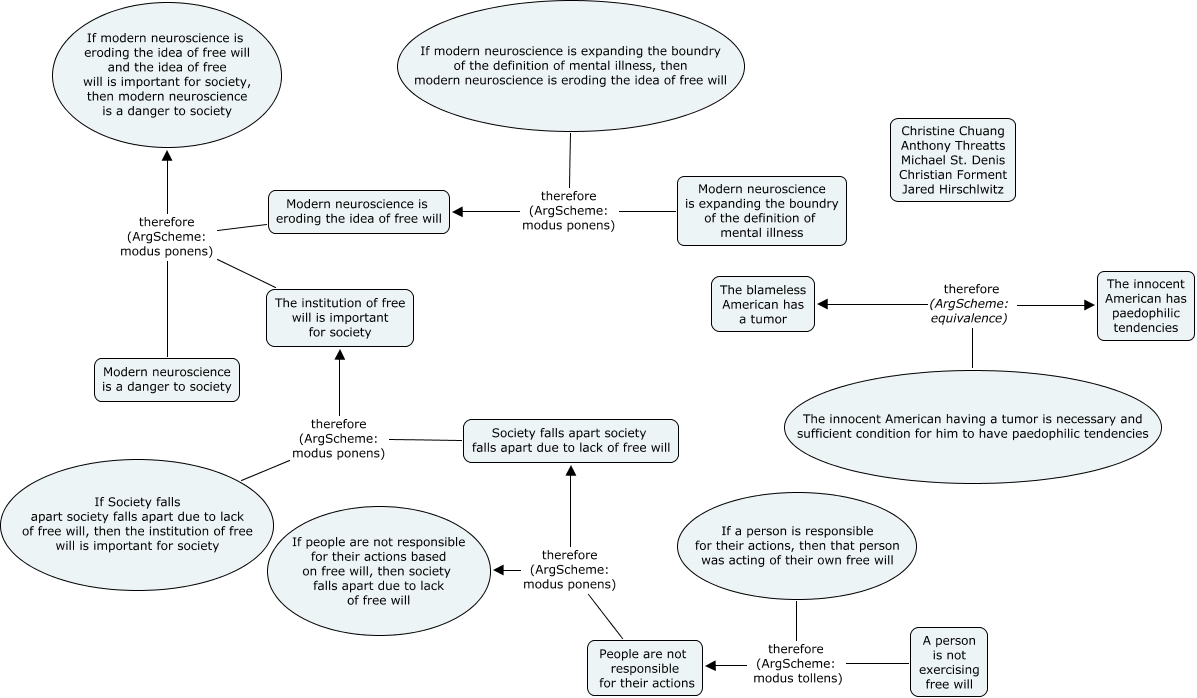 This Concept Map, created with IHMC CmapTools, has information related to: Group 7-Essay Free Will Assignment, Modern neuroscience is eroding the idea of free will therefore (ArgScheme: modus ponens) If modern neuroscience is eroding the idea of free will and the idea of free will is important for society, then modern neuroscience is a danger to society, A person is not exercising free will therefore (ArgScheme: modus tollens) People are not responsible for their actions, Modern neuroscience is expanding the boundry of the definition of mental illness therefore (ArgScheme: modus ponens) If modern neuroscience is expanding the boundry of the definition of mental illness, then modern neuroscience is eroding the idea of free will, A person is not exercising free will therefore (ArgScheme: modus tollens) If a person is responsible for their actions, then that person was acting of their own free will, People are not responsible for their actions therefore (ArgScheme: modus ponens) If people are not responsible for their actions based on free will, then society falls apart due to lack of free will, The institution of free will is important for society therefore (ArgScheme: modus ponens) If modern neuroscience is eroding the idea of free will and the idea of free will is important for society, then modern neuroscience is a danger to society, People are not responsible for their actions therefore (ArgScheme: modus ponens) Society falls apart society falls apart due to lack of free will, Modern neuroscience is expanding the boundry of the definition of mental illness therefore (ArgScheme: modus ponens) Modern neuroscience is eroding the idea of free will, The institution of free will is important for society therefore (ArgScheme: modus ponens) Modern neuroscience is a danger to society, Modern neuroscience is eroding the idea of free will therefore (ArgScheme: modus ponens) Modern neuroscience is a danger to society, The innocent American having a tumor is necessary and sufficient condition for him to have paedophilic tendencies therefore (ArgScheme: equivalence) The blameless American has a tumor, Society falls apart society falls apart due to lack of free will therefore (ArgScheme: modus ponens) If Society falls apart society falls apart due to lack of free will, then the institution of free will is important for society, Society falls apart society falls apart due to lack of free will therefore (ArgScheme: modus ponens) The institution of free will is important for society, The innocent American having a tumor is necessary and sufficient condition for him to have paedophilic tendencies therefore (ArgScheme: equivalence) The innocent American has paedophilic tendencies