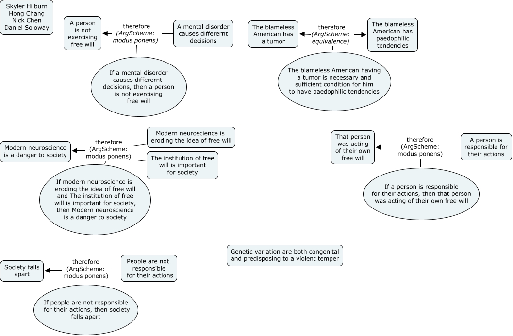 This Concept Map, created with IHMC CmapTools, has information related to: Group 2 - 5 Feb - Free Will or Not Free Will, Modern neuroscience is eroding the idea of free will therefore (ArgScheme: modus ponens) Modern neuroscience is a danger to society, A person is responsible for their actions therefore (ArgScheme: modus ponens) If a person is responsible for their actions, then that person was acting of their own free will, The institution of free will is important for society therefore (ArgScheme: modus ponens) Modern neuroscience is a danger to society, The blameless American having a tumor is necessary and sufficient condition for him to have paedophilic tendencies therefore (ArgScheme: equivalence) The blameless American has paedophilic tendencies, A person is responsible for their actions therefore (ArgScheme: modus ponens) That person was acting of their own free will, The institution of free will is important for society therefore (ArgScheme: modus ponens) If modern neuroscience is eroding the idea of free will and The institution of free will is important for society, then Modern neuroscience is a danger to society, A mental disorder causes differernt decisions therefore (ArgScheme: modus ponens) A person is not exercising free will, People are not responsible for their actions therefore (ArgScheme: modus ponens) If people are not responsible for their actions, then society falls apart, If a mental disorder causes differernt decisions, then a person is not exercising free will therefore (ArgScheme: modus ponens) A person is not exercising free will, Modern neuroscience is eroding the idea of free will therefore (ArgScheme: modus ponens) If modern neuroscience is eroding the idea of free will and The institution of free will is important for society, then Modern neuroscience is a danger to society, The blameless American having a tumor is necessary and sufficient condition for him to have paedophilic tendencies therefore (ArgScheme: equivalence) The blameless American has a tumor, People are not responsible for their actions therefore (ArgScheme: modus ponens) Society falls apart