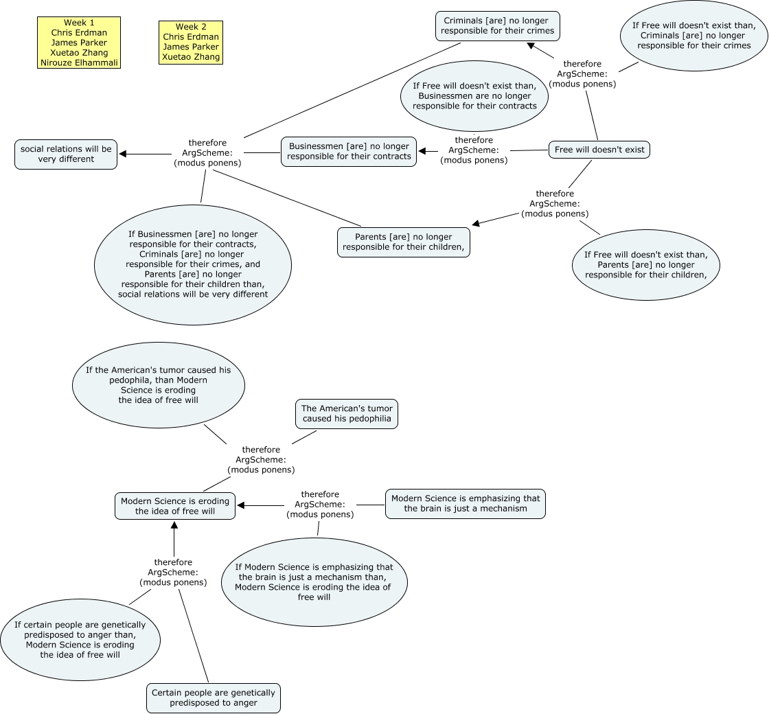 This Concept Map, created with IHMC CmapTools, has information related to: Group 4, Businessmen [are] no longer responsible for their contracts therefore ArgScheme: (modus ponens) social relations will be very different, If Free will doesn't exist than, Parents [are] no longer responsible for their children, therefore ArgScheme: (modus ponens) Parents [are] no longer responsible for their children,, If Free will doesn't exist than, Criminals [are] no longer responsible for their crimes therefore ArgScheme: (modus ponens) Criminals [are] no longer responsible for their crimes, Parents [are] no longer responsible for their children, therefore ArgScheme: (modus ponens) social relations will be very different, The American's tumor caused his pedophilia therefore ArgScheme: (modus ponens) Modern Science is eroding the idea of free will, Criminals [are] no longer responsible for their crimes therefore ArgScheme: (modus ponens) social relations will be very different, If certain people are genetically predisposed to anger than, Modern Science is eroding the idea of free will therefore ArgScheme: (modus ponens) Modern Science is eroding the idea of free will, Free will doesn't exist therefore ArgScheme: (modus ponens) Criminals [are] no longer responsible for their crimes, If Businessmen [are] no longer responsible for their contracts, Criminals [are] no longer responsible for their crimes, and Parents [are] no longer responsible for their children than, social relations will be very different therefore ArgScheme: (modus ponens) social relations will be very different, If the American's tumor caused his pedophila, than Modern Science is eroding the idea of free will therefore ArgScheme: (modus ponens) Modern Science is eroding the idea of free will, If Modern Science is emphasizing that the brain is just a mechanism than, Modern Science is eroding the idea of free will therefore ArgScheme: (modus ponens) Modern Science is eroding the idea of free will, If Free will doesn't exist than, Businessmen are no longer responsible for their contracts therefore ArgScheme: (modus ponens) Businessmen [are] no longer responsible for their contracts, Certain people are genetically predisposed to anger therefore ArgScheme: (modus ponens) Modern Science is eroding the idea of free will, Free will doesn't exist therefore ArgScheme: (modus ponens) Parents [are] no longer responsible for their children,, Free will doesn't exist therefore ArgScheme: (modus ponens) Businessmen [are] no longer responsible for their contracts, Modern Science is emphasizing that the brain is just a mechanism therefore ArgScheme: (modus ponens) Modern Science is eroding the idea of free will