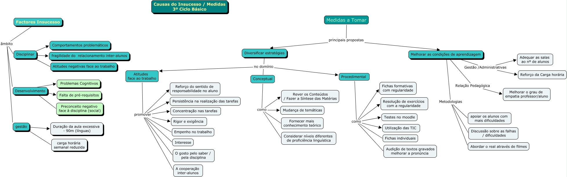 Esse mapa conceitual, produzido no IHMC CmapTools, tem a informação relacionada a: Medidas conducentes ao sucesso - 1º P, Desenvolvimento ???? Falta de pré-requisitos, Procedimental como Resolução de exercícios com a regularidade, Melhorar as condições de aprendizagem Metodologias apoiar os alunos com mais dificuldades, Procedimental como Fichas individuais, Diversificar estratégias no domínio Procedimental, Factores Insucesso âmbito Disciplinar, Melhorar as condições de aprendizagem Metodologias Abordar o real através de filmes, Procedimental como Audição de textos gravados melhorar a pronúncia, Diversificar estratégias no domínio Atitudes face ao trabalho, Atitudes face ao trabalho promover A cooperação inter-alunos, Diversificar estratégias no domínio Conceptual, Desenvolvimento ???? Problemas Cognitivos, Desenvolvimento ???? Preconceito negativo face à disciplina (social), Atitudes face ao trabalho promover Reforço do sentido de responsabilidade no aluno, Disciplinar ???? Atitudes negativas face ao trabalho, Atitudes face ao trabalho promover O gosto pelo saber / pela disciplina, Factores Insucesso âmbito gestão, Melhorar as condições de aprendizagem Relação Pedagógica Melhorar o grau de empatia professor/aluno, gestão ???? Duração da aula excessiva - 90m (línguas), Procedimental como Fichas formativas com regularidade