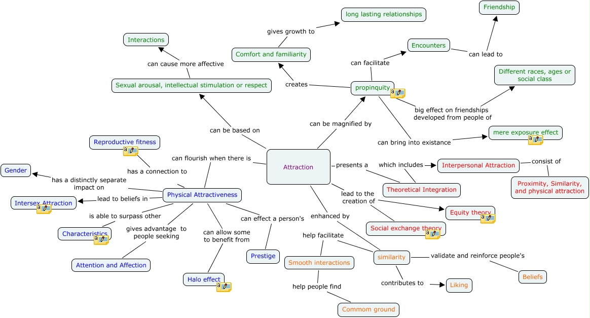 This Concept Map, created with IHMC CmapTools, has information related to: Attraction, propinquity creates Comfort and familiarity, Attraction can flourish when there is Physical Attractiveness, Attraction can be magnified by propinquity, Attraction can be based on Sexual arousal, intellectual stimulation or respect, propinquity big effect on friendships developed from people of Different races, ages or social class, Interpersonal Attraction consist of Proximity, Similarity, and physical attraction, Smooth interactions help people find Commom ground, Physical Attractiveness is able to surpass other Characteristics, similarity help facilitate Smooth interactions, Encounters can lead to Friendship, Physical Attractiveness can effect a person's Prestige, Sexual arousal, intellectual stimulation or respect can cause more affective Interactions, Physical Attractiveness lead to beliefs in Intersex Attraction, Attraction lead to the creation of Equity theory, similarity validate and reinforce people's Beliefs, Physical Attractiveness has a distinctly separate impact on Gender, Physical Attractiveness has a connection to Reproductive fitness, Attraction enhanced by similarity, Theoretical Integration which includes Interpersonal Attraction, Attraction lead to the creation of Social exchange theory