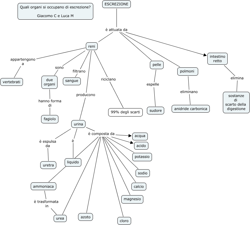 apparato escretore mappa concettuale giacomo c, due organi hanno forma di fagiolo, urina è composta da magnesio, ESCREZIONE è attuata da intestino retto, ESCREZIONE è attuata da reni, urina è composta da azoto, ESCREZIONE è attuata da pelle, urina è composta da calcio, urina è composta da potassio, intestino retto elimina sostanze di scarto della digestione, urina è composta da sodio