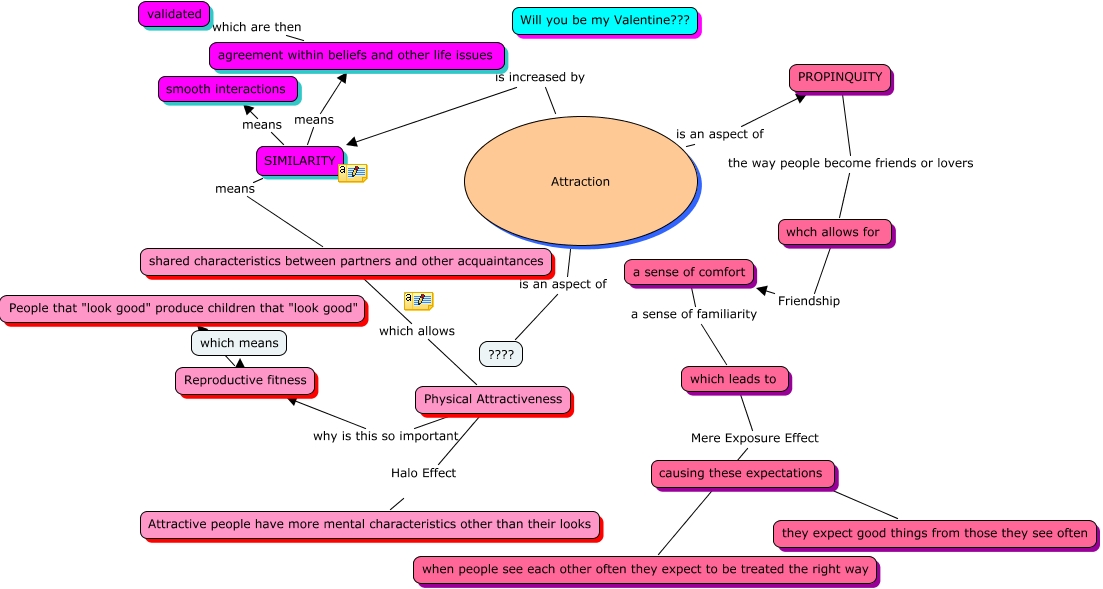 This Concept Map, created with IHMC CmapTools, has information related to: Attraction, PROPINQUITY the way people become friends or lovers whch allows for, Attraction is increased by SIMILARITY, SIMILARITY means agreement within beliefs and other life issues, a sense of comfort a sense of familiarity which leads to, whch allows for Friendship a sense of comfort, causing these expectations ???? they expect good things from those they see often, Physical Attractiveness why is this so important Reproductive fitness, Reproductive fitness ???? which means, Reproductive fitness ???? People that "look good" produce children that "look good", Physical Attractiveness Halo Effect Attractive people have more mental characteristics other than their looks, shared characteristics between partners and other acquaintances which allows Physical Attractiveness, Attraction is an aspect of PROPINQUITY, SIMILARITY means shared characteristics between partners and other acquaintances, Attraction is an aspect of ????, agreement within beliefs and other life issues which are then validated, which leads to Mere Exposure Effect when people see each other often they expect to be treated the right way, SIMILARITY means smooth interactions