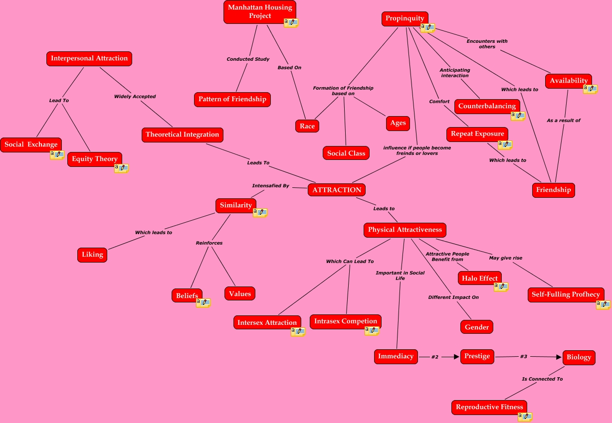 This Concept Map, created with IHMC CmapTools, has information related to: Attraction, Propinquity Formation of Friendship based on Social Class, Propinquity Formation of Friendship based on Ages, Physical Attractiveness May give rise Self-Fulling Profhecy, Propinquity Which leads to Friendship, Propinquity Formation of Friendship based on Race, Physical Attractiveness Which Can Lead To Intersex Attraction, Immediacy #2 Prestige, Similarity Reinforces Values, Biology Is Connected To Reproductive Fitness, ATTRACTION Leads to Physical Attractiveness, Theoretical Integration Leads To ATTRACTION, Physical Attractiveness Important in Social Life Immediacy, Propinquity Anticipating interaction Counterbalancing, Interpersonal Attraction Lead To Social Exchange, Interpersonal Attraction Lead To Equity Theory, Manhattan Housing Project Conducted Study Pattern of Friendship, Repeat Exposure Which leads to Friendship, Interpersonal Attraction Widely Accepted Theoretical Integration, ATTRACTION Intensafied By Similarity, Physical Attractiveness Different Impact On Gender