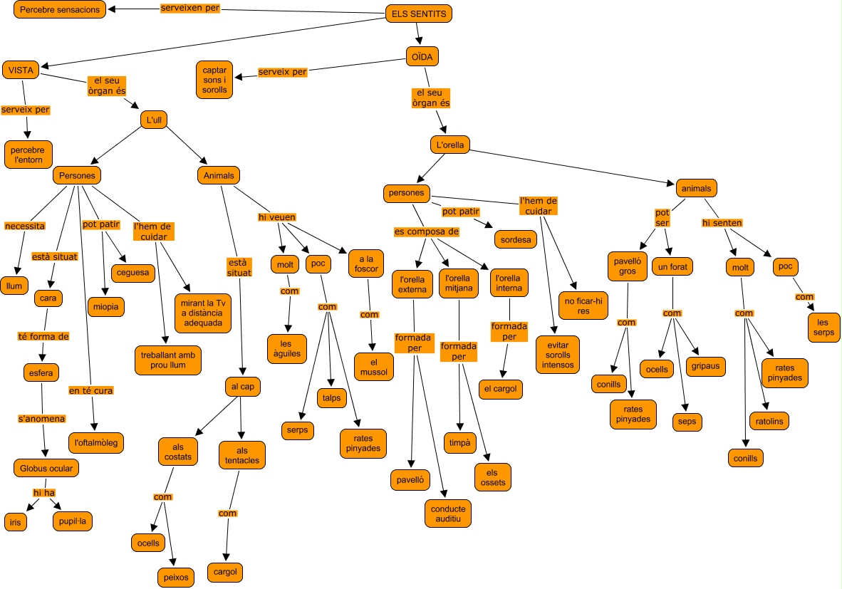 Aquest mapa conceptual conté informació relacionada amb: Sentits CM, als costats com peixos, L'orella ???? animals, Persones necessita llum, Persones pot patir miopia, persones es composa de l'orella externa, OÏDA el seu òrgan és L'orella, animals hi senten molt, animals hi senten poc, a la foscor com el mussol, Persones pot patir ceguesa, l'orella mitjana formada per els ossets, L'ull ???? Persones, Persones l'hem de cuidar treballant amb prou llum, als costats com ocells, l'orella externa formada per pavelló, OÏDA serveix per captar sons i sorolls, VISTA el seu òrgan és L'ull, Persones en té cura l'oftalmòleg, persones es composa de l'orella interna, molt com rates pinyades