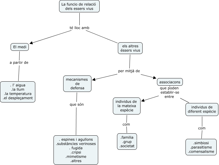Aquest mapa conceptual conté informació relacionada amb: Funció de relació essers vius 2, El medi a partir de . l' aigua .la llum .la temperatura .el despleçament, individus de la mateixa espècie com .familia .grup .societat, associacons que poden establir-se entre individus de la mateixa espècie, els altres éssers vius per mitjà de associacons, individus de diferent espècie com .simbiosi .parasitisme .comensalisme, mecanismes de defensa que són . espines i agullons .substàncies verinoses . fugida .cripsi .mimetisme .altres, La funcio de relació dels essers vius té lloc amb El medi, els altres éssers vius per mitjà de mecanismes de defensa, La funcio de relació dels essers vius té lloc amb els altres éssers vius, associacons que poden establir-se entre individus de diferent espècie