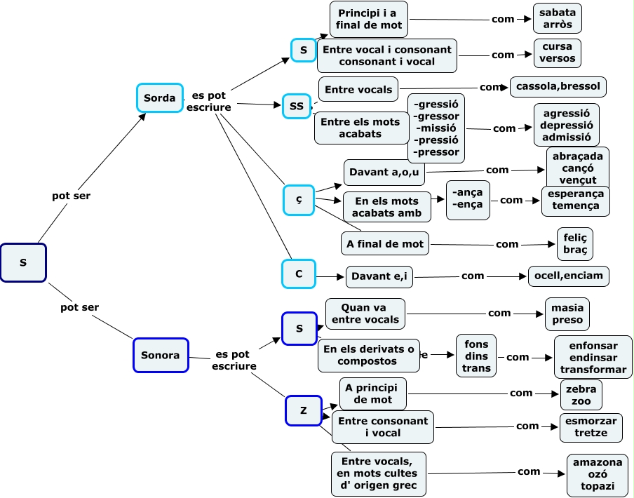 Aquest mapa conceptual conté informació relacionada amb: Ortografia S, Entre vocals com cassola,bressol, Z ???? Entre vocals, en mots cultes d' origen grec, A final de mot com feliç braç, Davant e,i com ocell,enciam, ç ???? En els mots acabats amb, Sorda es pot escriure ç, S pot ser Sonora, Entre consonant i vocal com esmorzar tretze, ç ???? Davant a,o,u, Davant a,o,u com abraçada cançó vençut, S a Principi i a final de mot, Sorda es pot escriure C, Entre vocal i consonant consonant i vocal com cursa versos, Sonora es pot escriure Z, Sorda es pot escriure S, Quan va entre vocals com masia preso, Sonora es pot escriure S, -ança -ença com esperança temença, En els mots acabats amb ???? -ança -ença, Principi i a final de mot com sabata arròs