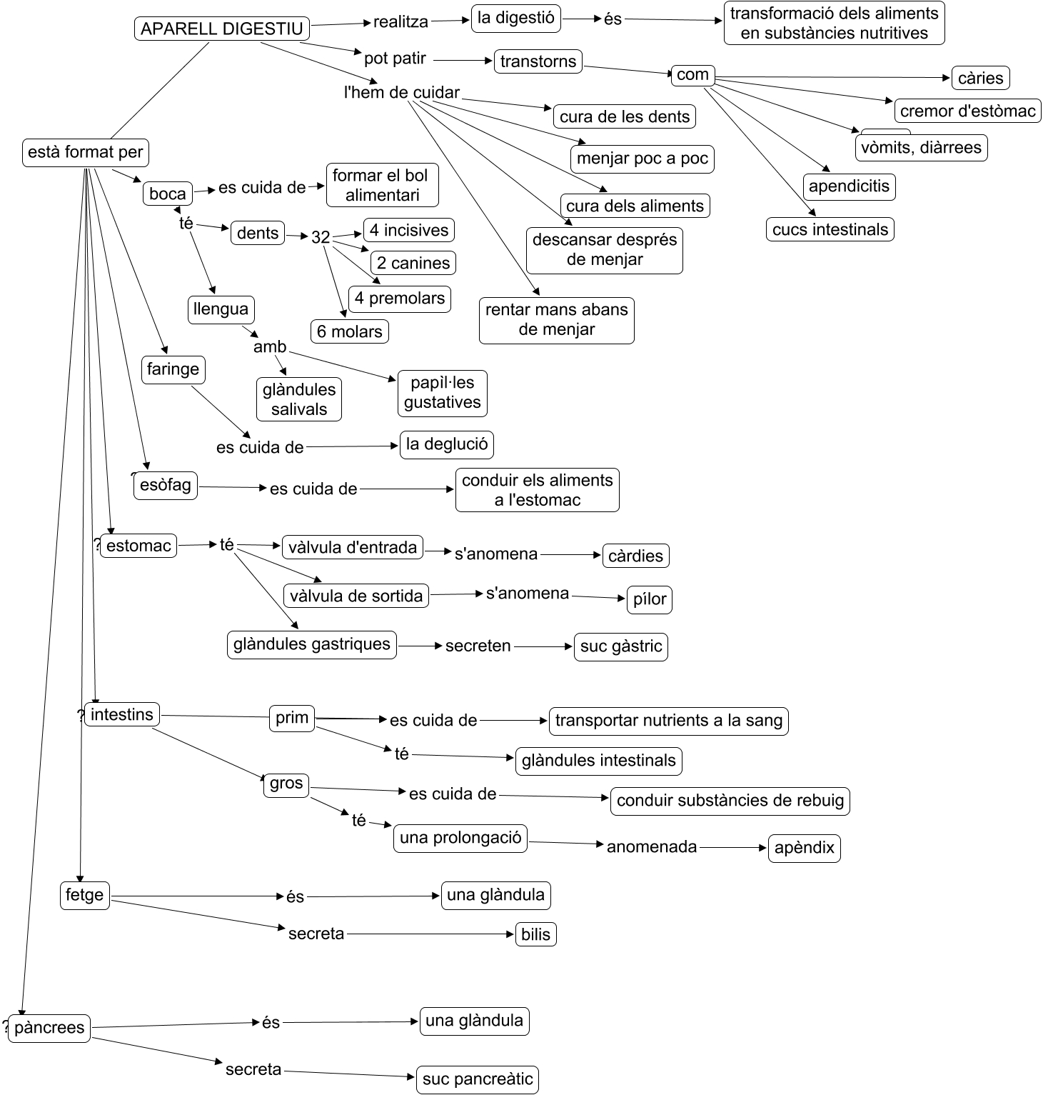 Aquest mapa conceptual conté informació relacionada amb: organitzador aparell digestiu, fetge és una glàndula, vàlvula d'entrada s'anomena càrdies, està format per ???? esòfag, està format per ???? fetge, com ???? cucs intestinals, està format per ???? faringe, fetge secreta bilis, APARELL DIGESTIU l'hem de cuidar cura dels aliments, esòfag es cuida de conduir els aliments a l'estomac, està format per ???? boca, gros es cuida de conduir substàncies de rebuig, com ???? apendicitis, està format per ???? pàncrees, dents 32 2 canines, transtorns com ????, està format per ???? estomac, dents 32 6 molars, boca té dents, dents 32 4 premolars, APARELL DIGESTIU realitza la digestió