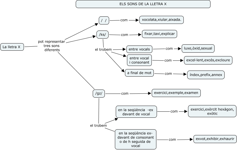 Aquest mapa conceptual conté informació relacionada amb: Sons X, /gz/ el trobem en la seqüència -ex davant de vocal, La lletra X pot representar tres sons diferents /gz/, /gz/ el trobem en la seqüència ex- davant de consonant o de h seguida de vocal, /gz/ com exercici,exemple,examen, /ks/ el trobem entre vocal i consonant, La lletra X pot representar tres sons diferents /ks/, La lletra X pot representar tres sons diferents / /, /ks/ el trobem a final de mot, /ks/ el trobem entre vocals, en la seqüència -ex davant de vocal com exercici,exèrcit hexàgon, exòtic, a final de mot com índex,prefix,annex, entre vocal i consonant com excel·lent,excés,excloure, en la seqüència ex- davant de consonant o de h seguida de vocal com exvot,exhibir,exhaurir, / / com xocolata,xiular,aixada., /ks/ com fixar,taxi,explicar, entre vocals com luxe,òxid,sexual