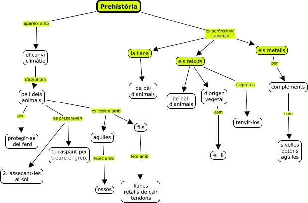 Aquest mapa conceptual conté informació relacionada amb: el vestit1 2, pell dels animals es preparaven 1. raspant per treure el greix, Prehistòria apareix amb el canvi climàtic, pell dels animals per protegir-se del ferd, els teixits d'origen vegetal, agulles fetes amb ossos, pell dels animals es cosien amb agulles, la llana de pèl d'animals, els teixits de pèl d'animals, els teixits s'aprèn a tenyir-los, Prehistòria es perfecciona i apareix els metalls, d'origen vegetal com el lli, pell dels animals es preparaven 2. assecant-les al sol, el canvi climàtic s'aprofiten pell dels animals, els metalls per complements, Prehistòria es perfecciona i apareix la llana, pell dels animals es cosien amb fils, Prehistòria es perfecciona i apareix els teixits, complements com sivelles botons agulles, fils fets amb lianes retalls de cuir tendons