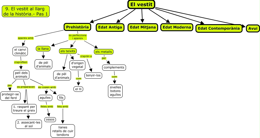 Aquest mapa conceptual conté informació relacionada amb: el vestit 1, pell dels animals es preparaven 2. assecant-les al sol, complements com sivelles botons agulles, el canvi climàtic s'aprofiten pell dels animals, El vestit Edat Contemporània, la llana de pèl d'animals, fils fets amb lianes retalls de cuir tendons, Prehistòria es perfecciona i apareix els teixits, els teixits s'aprèn a tenyir-los, El vestit Edat Antiga, El vestit Avui, Prehistòria es perfecciona i apareix la llana, El vestit Edat Moderna, agulles fetes amb ossos, pell dels animals es cosien amb fils, Prehistòria apareix amb el canvi climàtic, els teixits d'origen vegetal, pell dels animals per protegir-se del ferd, pell dels animals es preparaven 1. raspant per treure el greix, Prehistòria es perfecciona i apareix els metalls, El vestit Edat Mitjana