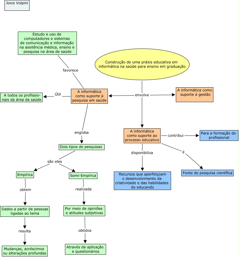 Joice Volpini, A informática como suporte à pesquisa em saúde engloba Dois tipos de pesquisas, Construção de uma práxis educativa em informática na saúde para ensino em graduação envolve A informática como suporte ao processo educativo, Empírica obtem Dados a partir de pessoas ligadas ao tema, A informática como suporte à pesquisa em saúde favorece Estudo e uso de computadores e sistemas de comunicação e informação na assitência médica, ensino e pesquisa na área de saúde, A informática como suporte ao processo educativo disponibiliza Recursos que aperfeiçoam o desenvolvimento da criatividade e das habilidades do educando, A informática como suporte à pesquisa em saúde Útil A todos os profissio- nais da área da saúde, Construção de uma práxis educativa em informática na saúde para ensino em graduação envolve A informática como suporte à pesquisa em saúde, Dois tipos de pesquisas são eles Semi-Empírica, Por meio de opiniões e atitudes subjetivas obtidos Através da aplicação e questionários, A informática como suporte ao processo educativo é Fonte de pesquisa científica