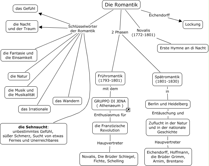 Questa Cmap, creata con IHMC CmapTools, contiene informazioni relative a: DIE ROMANTIK, Die Romantik Schlüsselwörter der Romantik die Nacht und der Traum, Die Romantik Novalis (1772-1801) Erste Hymne an di Nacht, Frühromantik (1793-1801) mit dem GRUPPO DI JENA ( Athenaeum ), GRUPPO DI JENA ( Athenaeum ) Enthusiasmus für die Franzözische Revolution, Zuflucht in der Natur und in der nationale Geschichte Haupvertreter Eichendorff, Hoffmann, die Brüder Grimm, Arnim, Brentano, Die Romantik Schlüsselwörter der Romantik die Musik und die Musikalität, die Franzözische Revolution Haupvertreter Novalis, Die Brüder Schlegel, Fichte, Schelling, Die Romantik Schlüsselwörter der Romantik das Wandern, Die Romantik Schlüsselwörter der Romantik das Irrationale, Die Romantik 2 Phasen Frühromantik (1793-1801), Berlin und Heidelberg Entäuschung und Zuflucht in der Natur und in der nationale Geschichte, Die Romantik Eichendorff Lockung, Die Romantik Schlüsselwörter der Romantik die Sehnsucht: unbestimmtes Gefühl, süßer Schmerz, Sucht von etwas Fernes und Unerreichbares, Spätromantik (1801-1830) in Berlin und Heidelberg, Die Romantik Schlüsselwörter der Romantik das Gefühl, Die Romantik 2 Phasen Spätromantik (1801-1830), Die Romantik Schlüsselwörter der Romantik die Natur, Die Romantik Schlüsselwörter der Romantik die Fantasie und die Einsamkeit