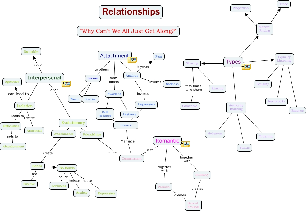 This Concept Map, created with IHMC CmapTools, has information related to: Relationships, No-Bonds induce Lonliness, Secure ???? Warm, Evolutionary ???? Friendships, Romantic with Commitment, Secure ???? Positive, Divorce Marriage Commitment, Authority Ranking ???? Ordering, Anxious invokes Sadness, Authority Ranking ???? Heirarchy, No-Bonds induce Depression, Attachment from others Avoidant, Market Pricing ???? Trade, Interpersonal ???? Isolation, Isolation leads to Difficulties, Romantic together with Passion, Difficulties leads to Abandonment, Types ???? Authority Ranking, Equality Matching ???? Balance, Bonds are Positive, Anxious invokes Depression