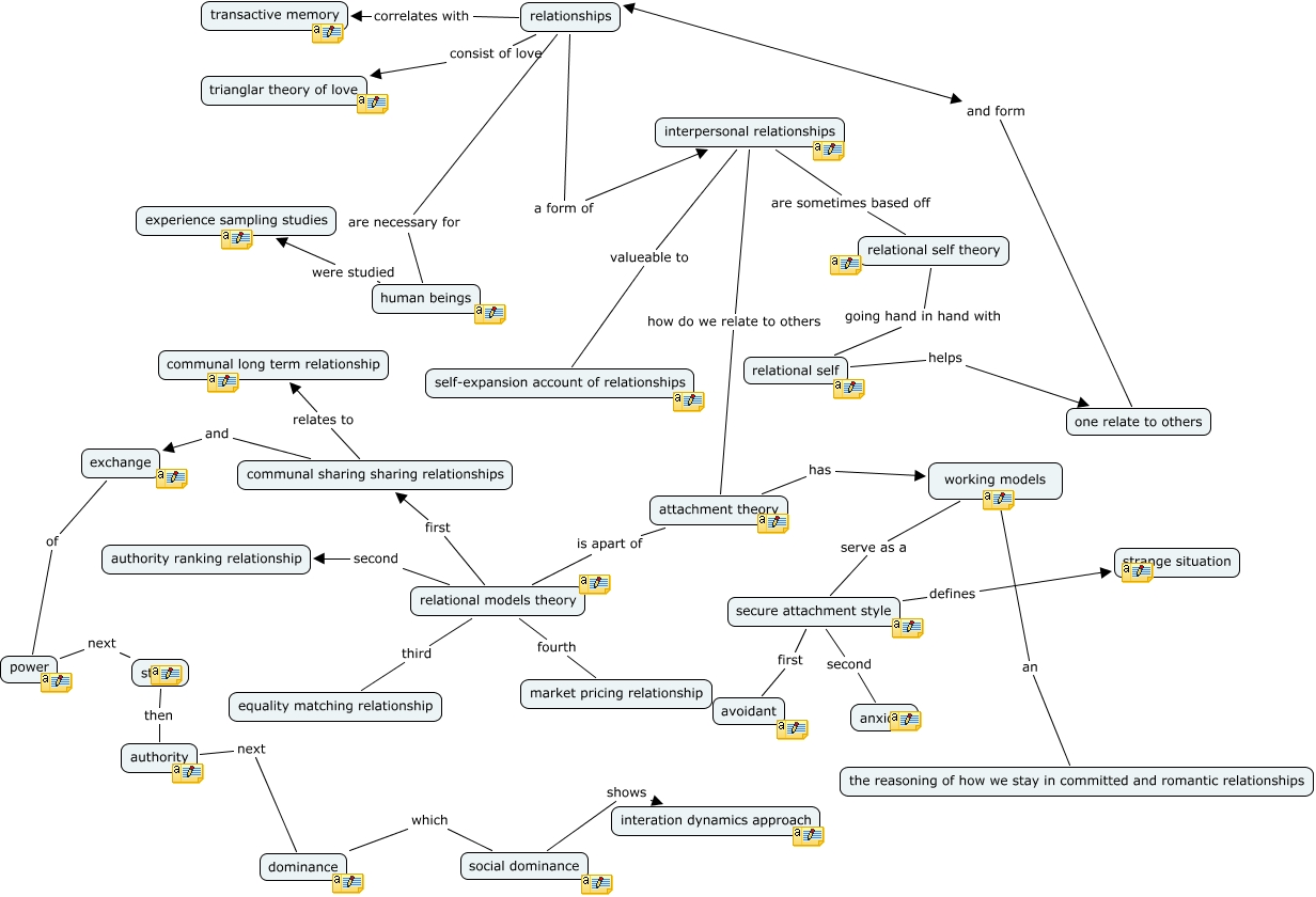 This Concept Map, created with IHMC CmapTools, has information related to: Relationships, exchange of power, communal sharing sharing relationships relates to communal long term relationship, attachment theory is apart of relational models theory, relational self helps one relate to others, relational models theory first communal sharing sharing relationships, social dominance shows interation dynamics approach, working models serve as a secure attachment style, relational models theory fourth market pricing relationship, relational models theory third equality matching relationship, working models an the reasoning of how we stay in committed and romantic relationships, interpersonal relationships valueable to self-expansion account of relationships, human beings were studied experience sampling studies, authority next dominance, status then authority, secure attachment style defines strange situation, relationships are necessary for human beings, relationships correlates with transactive memory, relational self theory going hand in hand with relational self, interpersonal relationships are sometimes based off relational self theory, relationships a form of interpersonal relationships