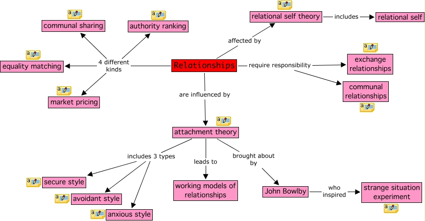 This Concept Map, created with IHMC CmapTools, has information related to: Relationships, Relationships 4 different kinds market pricing, Relationships 4 different kinds authority ranking, Relationships require responsibility exchange relationships, relational self theory includes relational self, John Bowlby who inspired strange situation experiment, Relationships are influenced by attachment theory, attachment theory brought about by John Bowlby, Relationships affected by relational self theory, attachment theory leads to working models of relationships, Relationships 4 different kinds equality matching, attachment theory includes 3 types anxious style, attachment theory includes 3 types avoidant style, Relationships require responsibility communal relationships, attachment theory includes 3 types secure style, Relationships 4 different kinds communal sharing