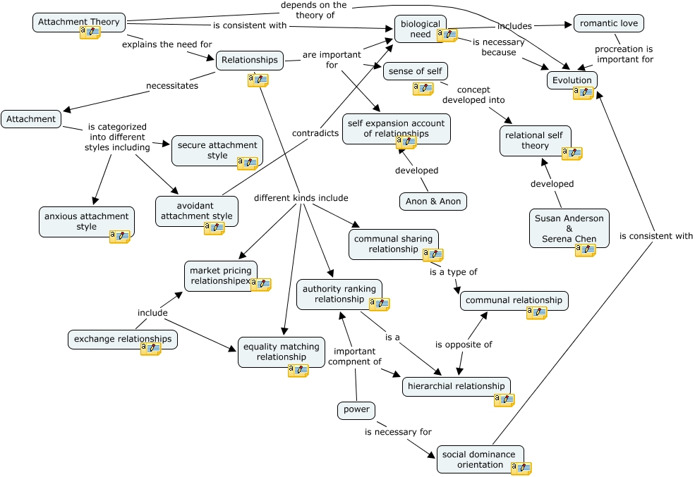 This Concept Map, created with IHMC CmapTools, has information related to: Relationships, Relationships necessitates Attachment, Relationships are important for biological need, Relationships different kinds include authority ranking relationship, biological need includes romantic love, sense of self concept developed into relational self theory, Susan Anderson & Serena Chen developed relational self theory, Relationships are important for self expansion account of relationships, power important compnent of hierarchial relationship, Attachment is categorized into different styles including avoidant attachment style, exchange relationships include market pricing relationshipex, Anon & Anon developed self expansion account of relationships, romantic love procreation is important for Evolution, authority ranking relationship is a hierarchial relationship, Attachment is categorized into different styles including secure attachment style, biological need is necessary because Evolution, Attachment Theory explains the need for Relationships, Relationships different kinds include market pricing relationshipex, exchange relationships include equality matching relationship, Attachment Theory depends on the theory of Evolution, Relationships are important for sense of self