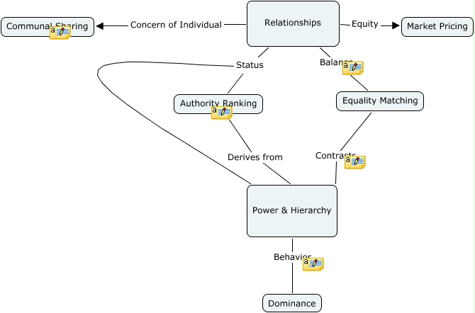 This Concept Map, created with IHMC CmapTools, has information related to: Relationships, Relationships Equity Market Pricing, Equality Matching Contrasts Power & Hierarchy, Authority Ranking Derives from Power & Hierarchy, Power & Hierarchy Behavior Dominance, Relationships Concern of Individual Communal Sharing, Relationships Balance Equality Matching, Relationships Status Power & Hierarchy, Relationships Status Authority Ranking