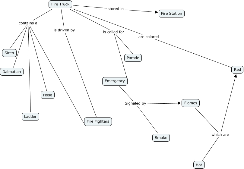 This Concept Map, created with IHMC CmapTools, has information related to: fire truck, Fire Truck is driven by Fire Fighters, Flames which are Red, Fire Truck contains a Siren, Fire Truck stored in Fire Station, Fire Truck contains a Hose, Fire Truck contains a Fire Fighters, Flames which are Hot, Emergency Signaled by Flames, Emergency Signaled by Smoke, Fire Truck contains a Dalmatian, Fire Truck is called for Emergency, Fire Truck are colored Red, Fire Truck is called for Parade, Fire Truck contains a Ladder