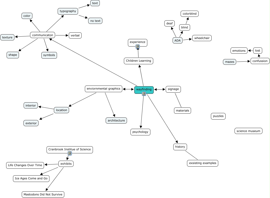 This Concept Map, created with IHMC CmapTools, has information related to: Marshall Thesis Show, wayfinding Children Learning, location exterior, enviornmental graphics architecture, communicaton color, mazes confussion, exhibits Life Changes Over Time, wayfinding history, signage materials, exhibits Mastodons Did Not Survive, typography text, wayfinding psychology, exhibits Ice Ages Come and Go, communicaton symbols, lost emotions, communicaton verbal, Children Learning experience, ADA blind, location interior, communicaton typography, communicaton texture