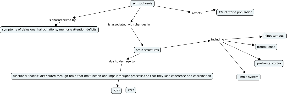 This Concept Map, created with IHMC CmapTools, has information related to: schizophrenia_bn, schizophrenia is associated with changes in brain structures, schizophrenia is characterized by symptoms of delusions, hallucinations, memory/attention deficits, schizophrenia affects 1% of world population, brain structures including hippocampus,, brain structures including limbic system, brain structures including frontal lobes, brain structures including prefrontal cortex, brain structures due to damage to ????