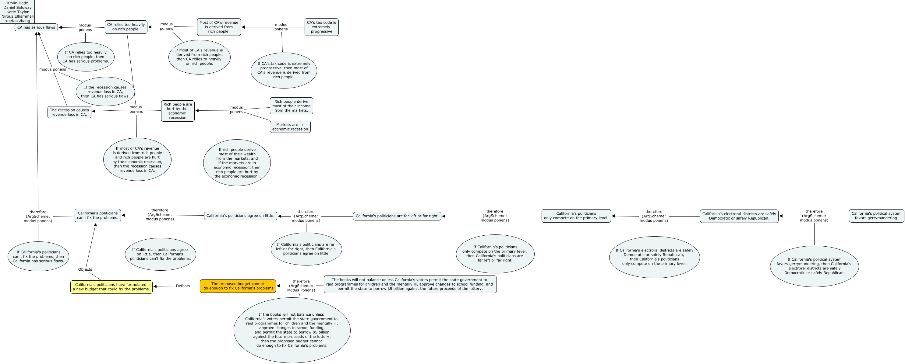 This Concept Map, created with IHMC CmapTools, has information related to: CA Group Project - Nirouz, California's politicians are far left or far right. therefore (ArgScheme: modus ponens) California's politicians agree on little., California's politicians only compete on the primary level. therefore (ArgScheme: modus ponens) California's politicians are far left or far right., If the recession causes revenue loss in CA, then CA has serious flaws. modus ponens CA has serious flaws, Rich people are hurt by the economic recession modus ponens The recession causes revenue loss in CA., If California's electroral districts are safely Democratic or safely Republican, then California's politicians only compete on the primary level. therefore (ArgScheme: modus ponens) California's politicians only compete on the primary level., Most of CA's revenue is derived from rich people. modus ponens CA relies too heavily on rich people., The recession causes revenue loss in CA. modus ponens CA has serious flaws, CA relies too heavily on rich people. modus ponens If CA relies too heavily on rich people, then CA has serious problems., California's politicians can't fix the problems. therefore (ArgScheme: modus ponens) CA has serious flaws, Rich people derive most of their income from the markets. modus ponens Rich people are hurt by the economic recession, If California's politicians are far left or far right, then California's politicians agree on little. therefore (ArgScheme: modus ponens) California's politicians agree on little., CA relies too heavily on rich people. modus ponens CA has serious flaws, California's political system favors gerrymandering. therefore (ArgScheme: modus ponens) California's electroral districts are safely Democratic or safely Republican., Most of CA's revenue is derived from rich people. modus ponens If most of CA's revenue is derived from rich people, then CA relies to heavily on rich people., Markets are in economic recession modus ponens If rich people derive most of their wealth from the markets, and if the markets are in economic recession, then rich people are hurt by the economic recessionl., California's politicians have formulated a new budget that could fix the problems. Objects California's politicians can't fix the problems., CA's tax code is extremely progressive modus ponens If CA's tax code is extremely progressive, then most of CA's revenue is derived from rich people., The proposed budget cannot do enough to fix California's problems Defeats California's politicians have formulated a new budget that could fix the problems., California's electroral districts are safely Democratic or safely Republican. therefore (ArgScheme: modus ponens) California's politicians only compete on the primary level., Rich people derive most of their income from the markets. modus ponens If rich people derive most of their wealth from the markets, and if the markets are in economic recession, then rich people are hurt by the economic recessionl.