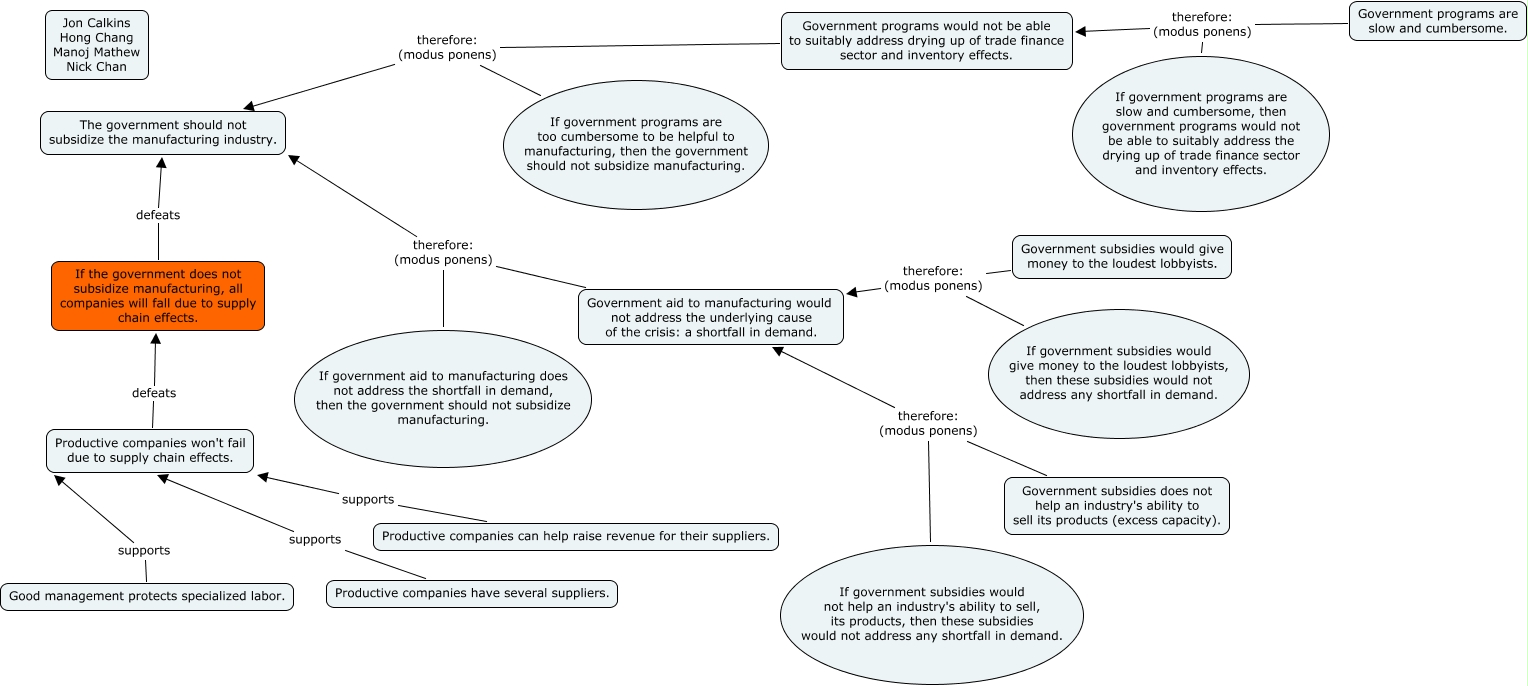 This Concept Map, created with IHMC CmapTools, has information related to: Manufacturing Collapse, Good management protects specialized labor. supports Productive companies won't fail due to supply chain effects., If government aid to manufacturing does not address the shortfall in demand, then the government should not subsidize manufacturing. therefore: (modus ponens) The government should not subsidize the manufacturing industry., Government subsidies does not help an industry's ability to sell its products (excess capacity). therefore: (modus ponens) Government aid to manufacturing would not address the underlying cause of the crisis: a shortfall in demand., If government programs are too cumbersome to be helpful to manufacturing, then the government should not subsidize manufacturing. therefore: (modus ponens) The government should not subsidize the manufacturing industry., Government aid to manufacturing would not address the underlying cause of the crisis: a shortfall in demand. therefore: (modus ponens) The government should not subsidize the manufacturing industry., Productive companies won't fail due to supply chain effects. defeats If the government does not subsidize manufacturing, all companies will fall due to supply chain effects., Productive companies can help raise revenue for their suppliers. supports Productive companies won't fail due to supply chain effects., Government programs would not be able to suitably address drying up of trade finance sector and inventory effects. therefore: (modus ponens) The government should not subsidize the manufacturing industry., If government subsidies would not help an industry's ability to sell, its products, then these subsidies would not address any shortfall in demand. therefore: (modus ponens) Government aid to manufacturing would not address the underlying cause of the crisis: a shortfall in demand., Government subsidies would give money to the loudest lobbyists. therefore: (modus ponens) Government aid to manufacturing would not address the underlying cause of the crisis: a shortfall in demand., If government subsidies would give money to the loudest lobbyists, then these subsidies would not address any shortfall in demand. therefore: (modus ponens) Government aid to manufacturing would not address the underlying cause of the crisis: a shortfall in demand., Government programs are slow and cumbersome. therefore: (modus ponens) Government programs would not be able to suitably address drying up of trade finance sector and inventory effects., Productive companies have several suppliers. supports Productive companies won't fail due to supply chain effects., If government programs are slow and cumbersome, then government programs would not be able to suitably address the drying up of trade finance sector and inventory effects. therefore: (modus ponens) Government programs would not be able to suitably address drying up of trade finance sector and inventory effects., If the government does not subsidize manufacturing, all companies will fall due to supply chain effects. defeats The government should not subsidize the manufacturing industry.